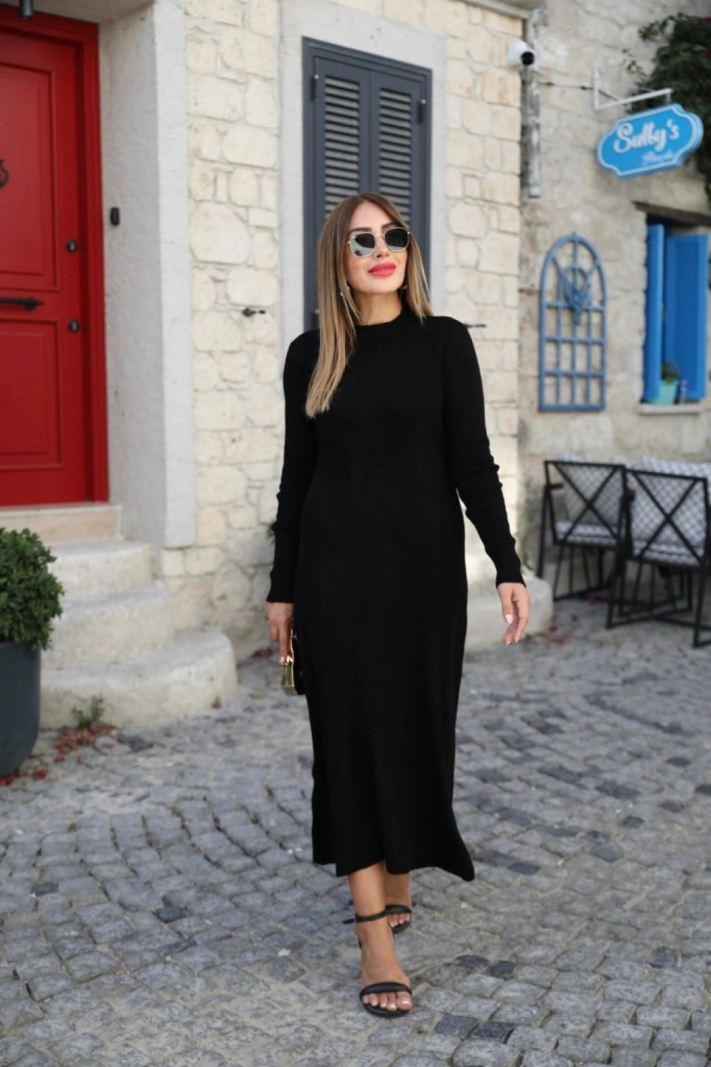 Kadın Uzun Kollu Yarı Balıkçı Yaka Arkadan Pencere Detaylı Bağcıklı Midi Triko Elbise