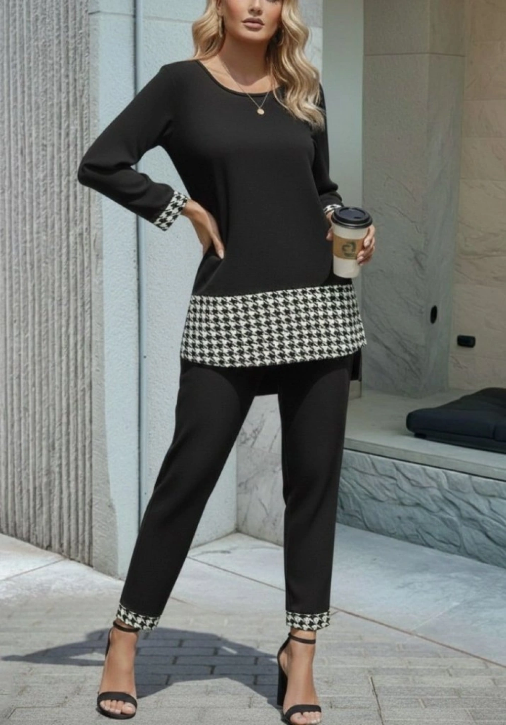 Kadın Uzun Kollu Yuvarlak Yakalı Kaz Ayağı Detaylı Viskon Iki Iplik Bluz Ve Pantolon Ikili Takım