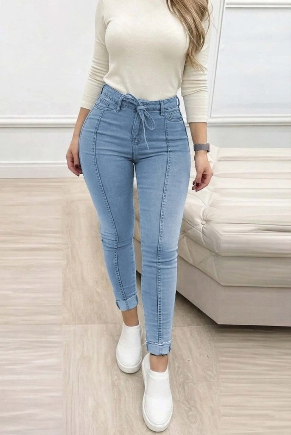 Kadın Yüksek Bel Belden Kuşaklı Yırtık Detaylı Kot Pantolon