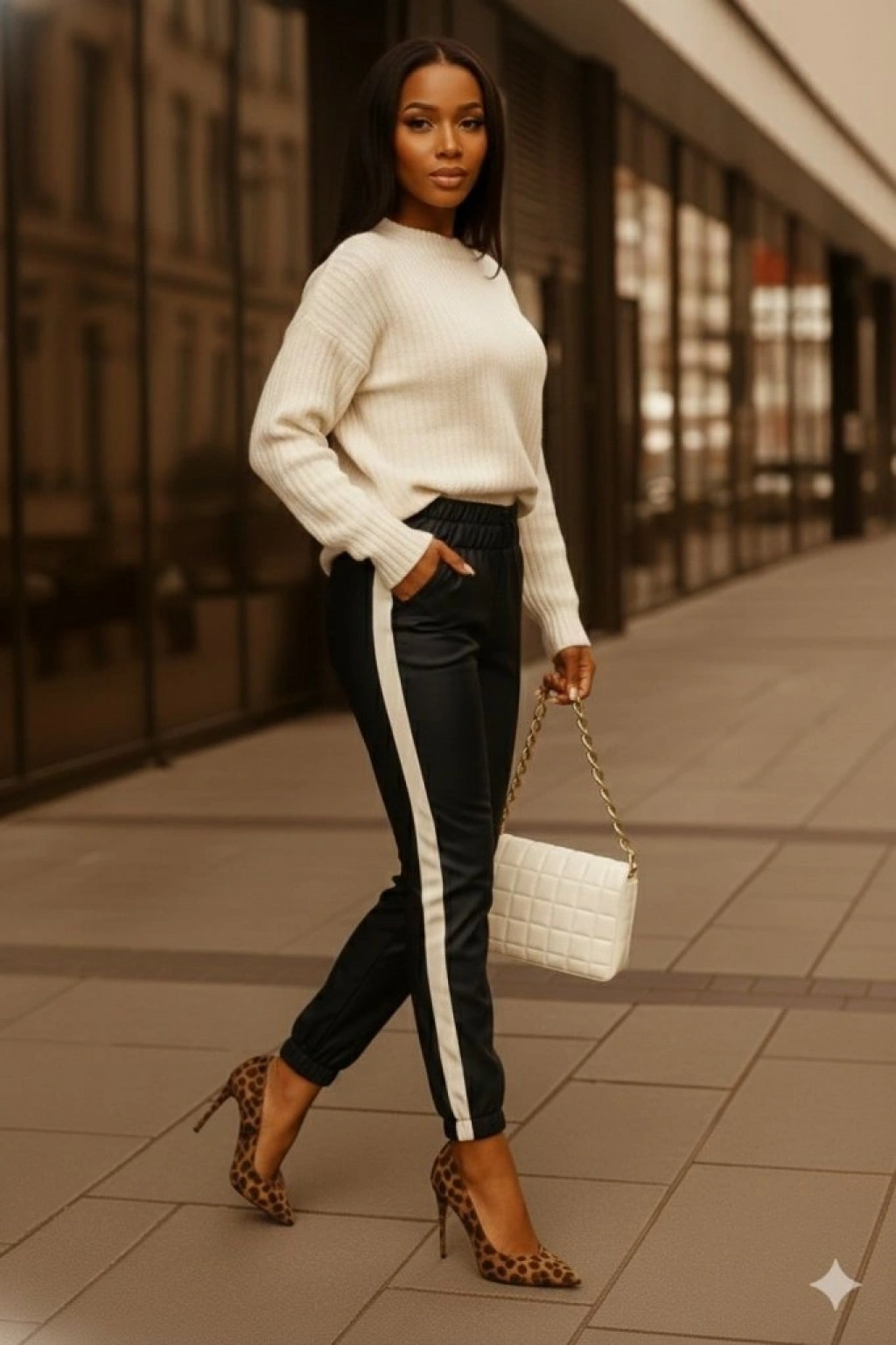 Kadın Yüksek Bel Lastikli Yan şerit Detaylı Deri Pantolon