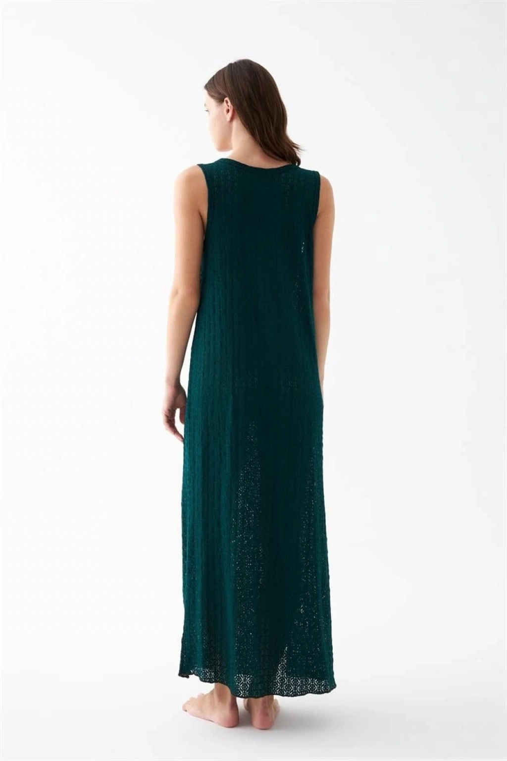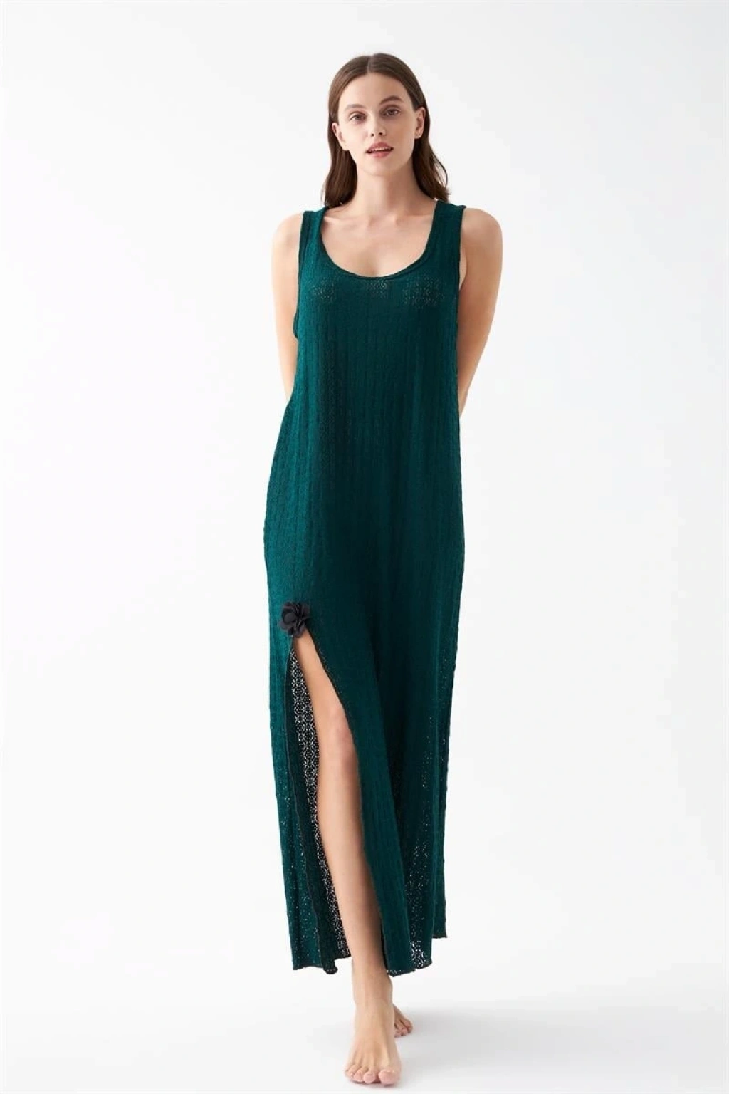 Dantel dokulu yüzey tasarımı geceliğe feminen bir şıklık kazandırırken, yan yırtmaç detayı hareket kolaylığı sağlayarak kullanım rahatlığını artırır. Zümrüt yeşilinin dikkat çekici ve zarif tonu gece giyimine modern bir dokunuş katmaktadır.