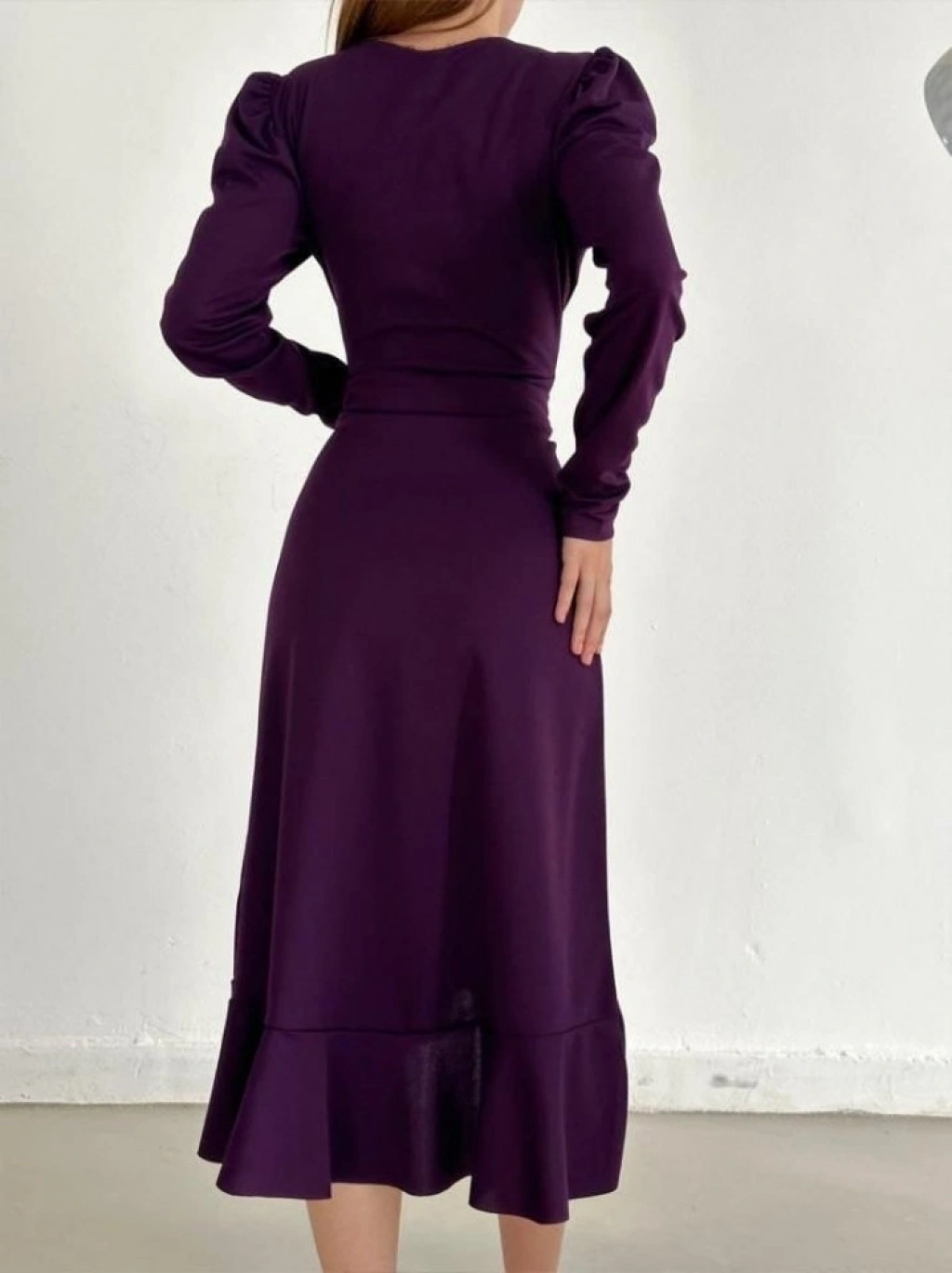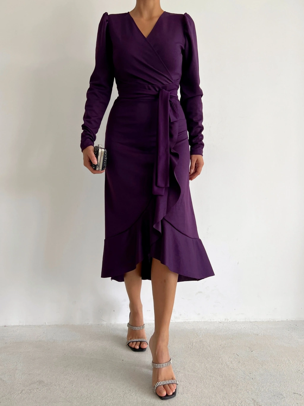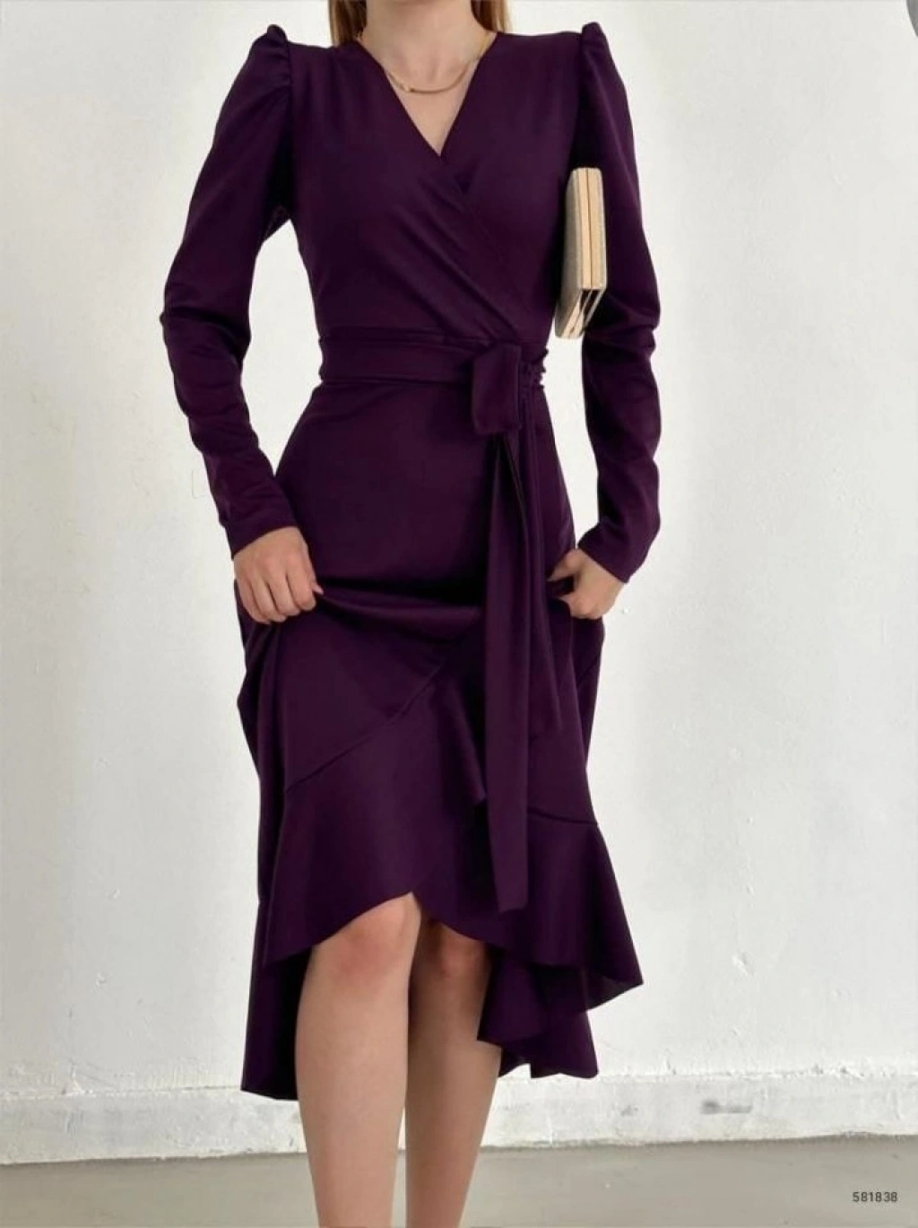 Krep Kumaş Midi Boy Kuşaklı Uzunkol Elbise