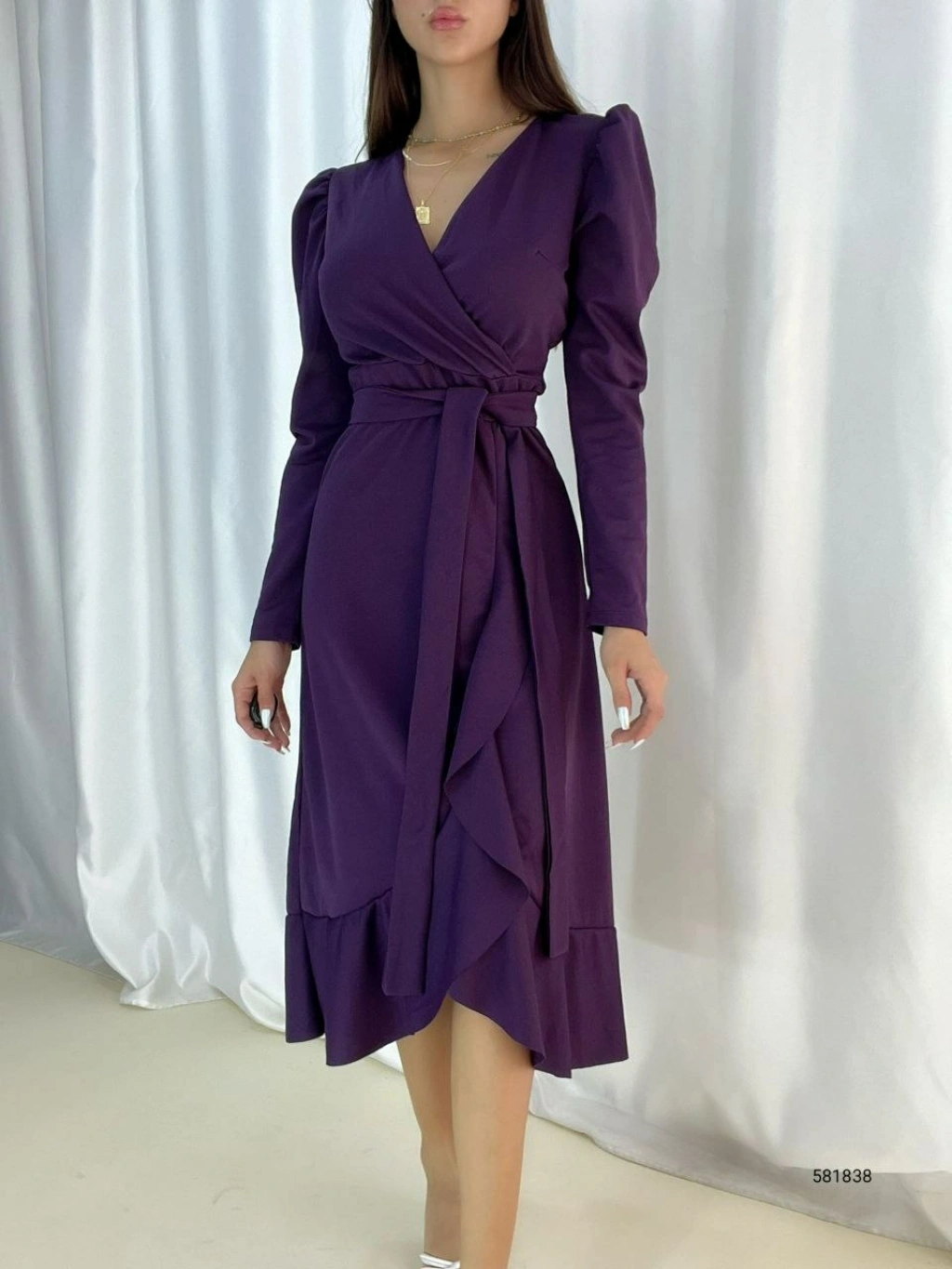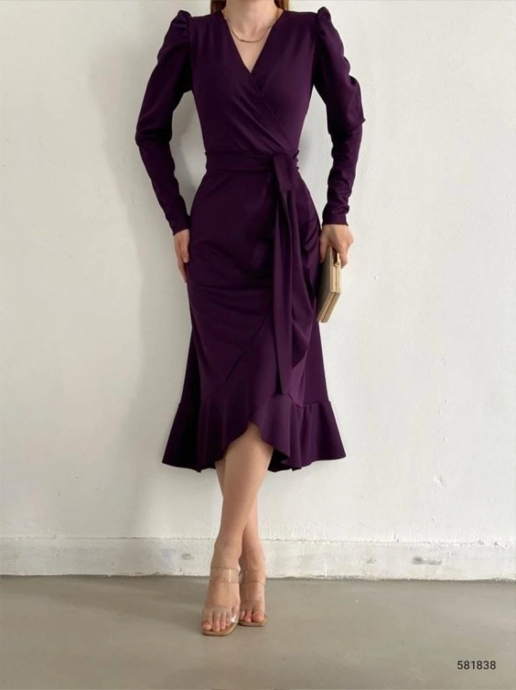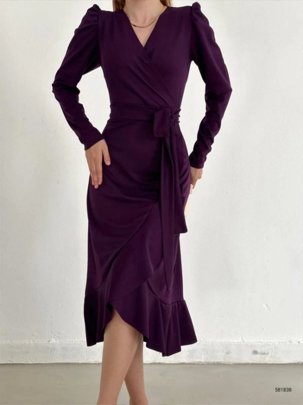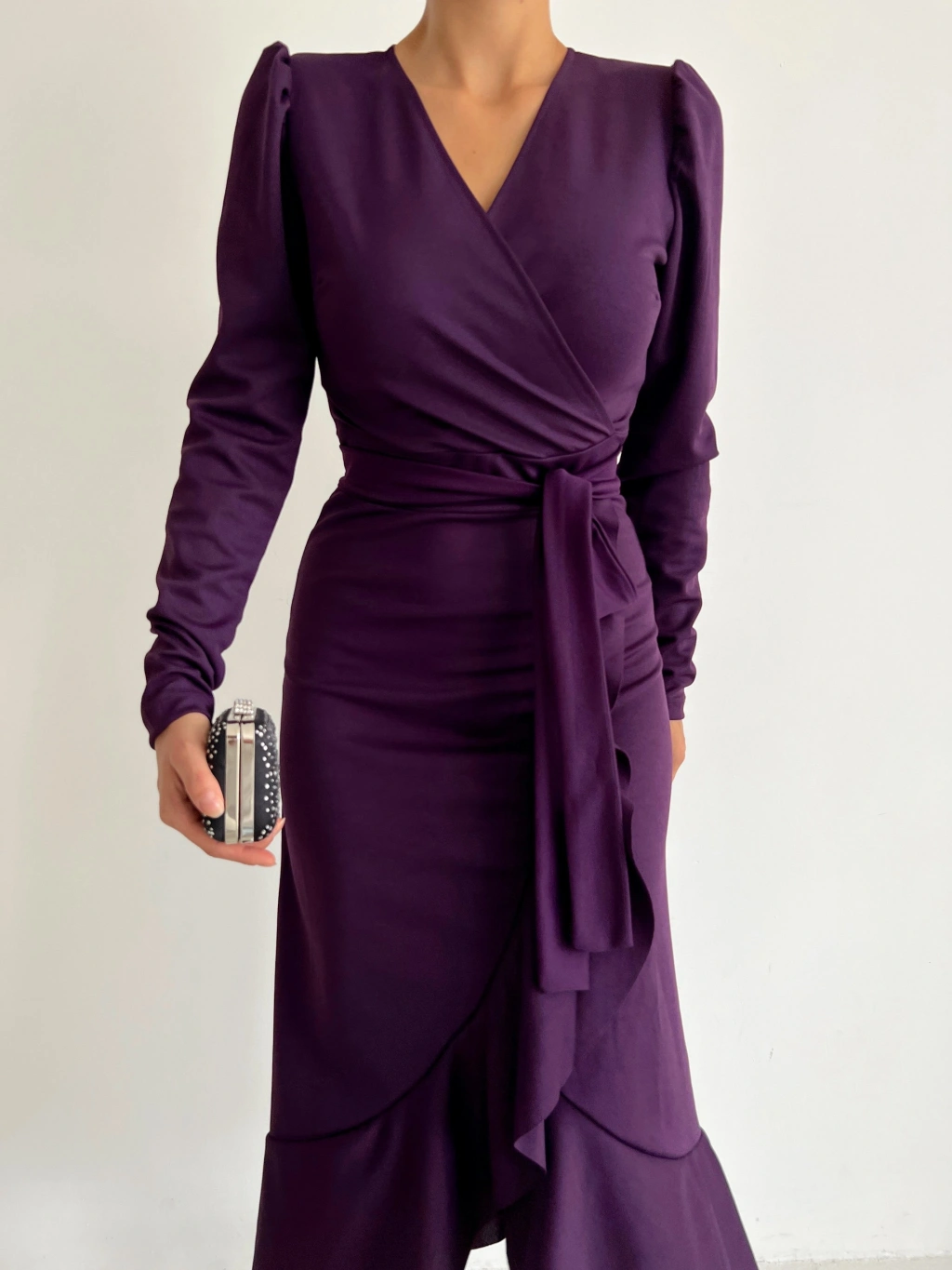 Krep Kumaş Midi Boy Kuşaklı Uzunkol Elbise