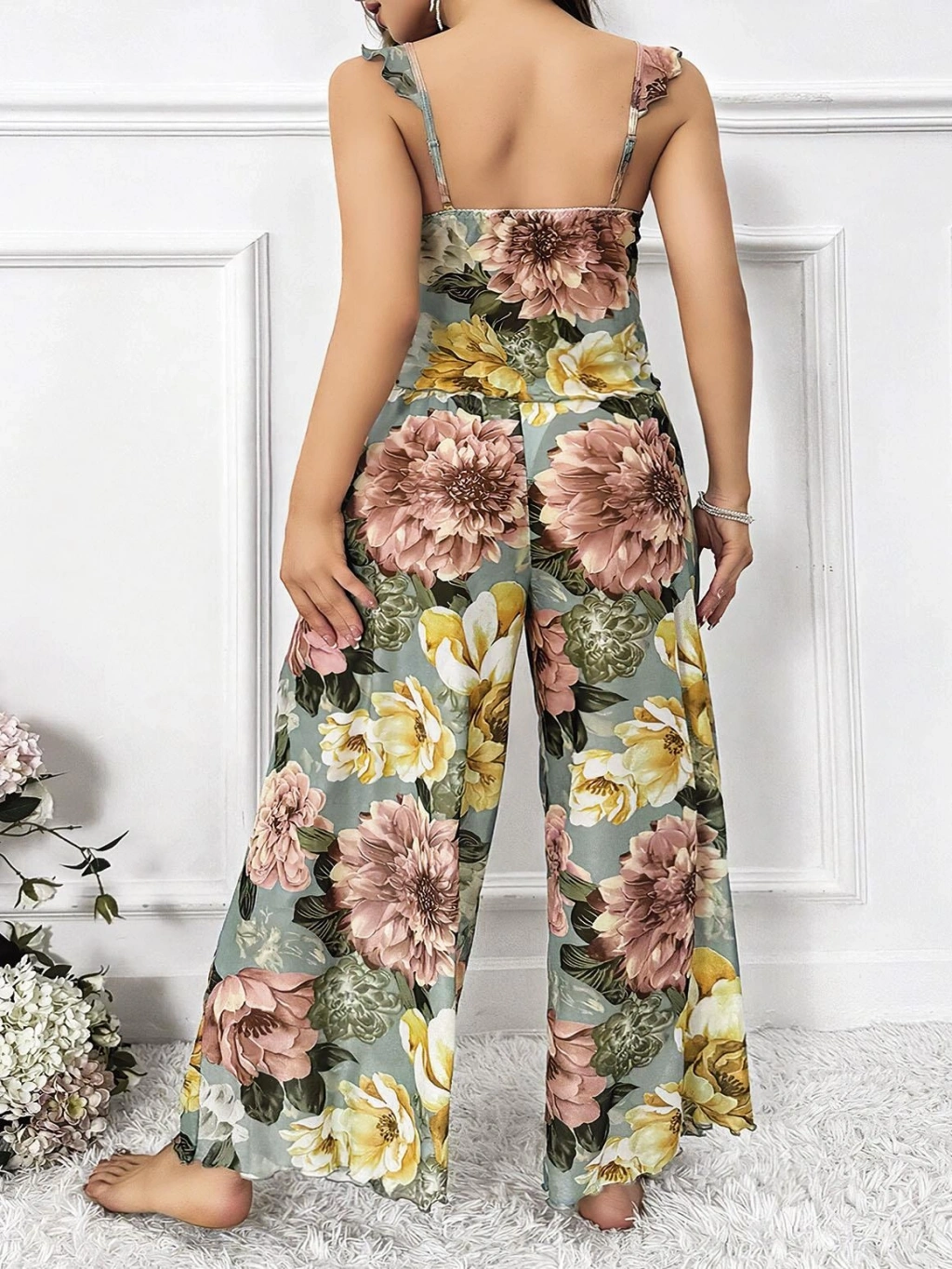Özel Tasarım Büyük Beden Çiçek Desenli Fırfırlı 2'li Pijama Takımı
