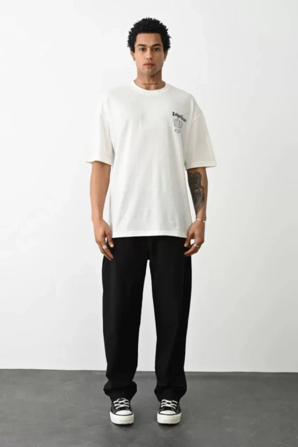 MARSiLYAN- Erkek Bisiklet Yakalı Sırt Baskılı Oversize T-Shirt - Beyaz