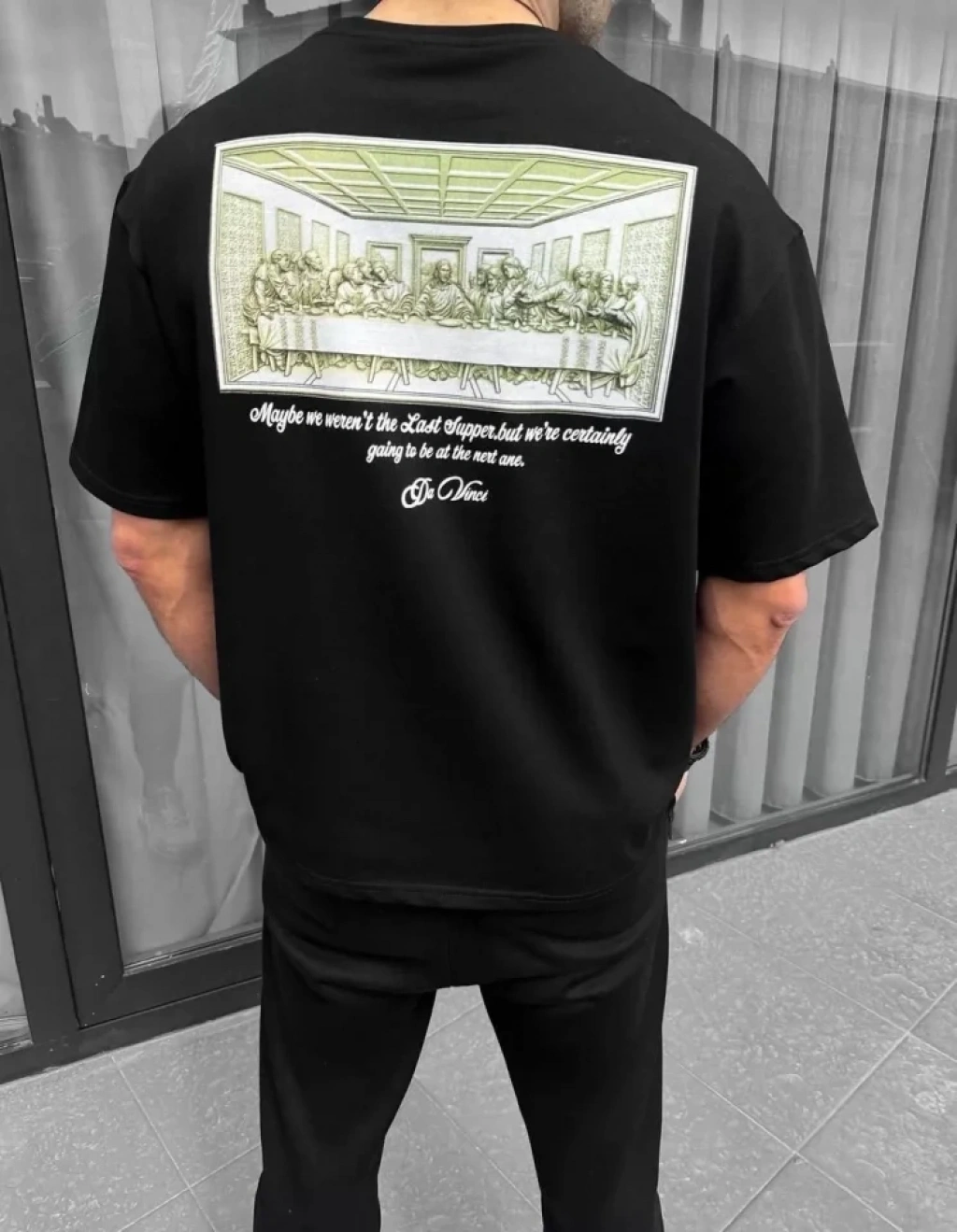 MARSiLYAN- Erkek Bisiklet Yakalı Sırt Baskılı Oversize T-Shirt - Siyah