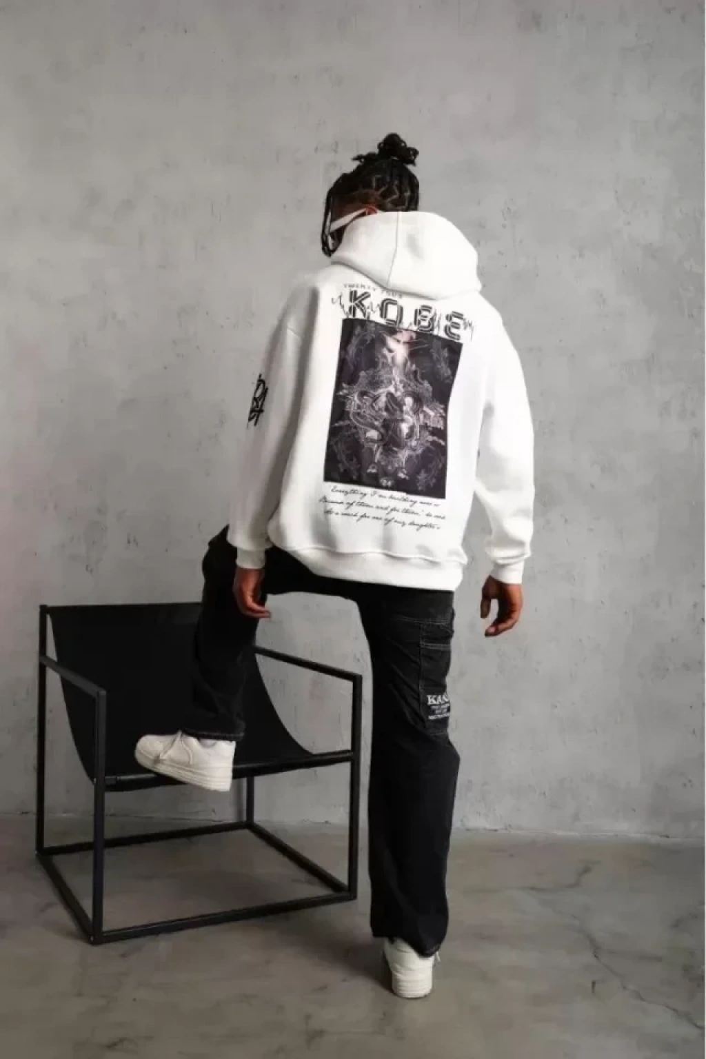 Unisex Sırt Baskılı Kapüşonlu Üç İplik Oversize Sweatshirt - Beyaz