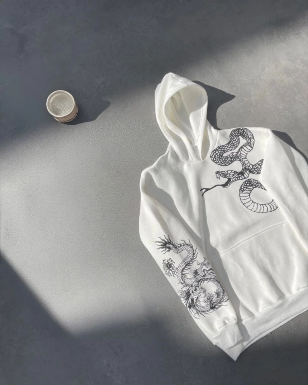 Uzun Kol Kapşonlu Baskılı SweatShirt - Beyaz
