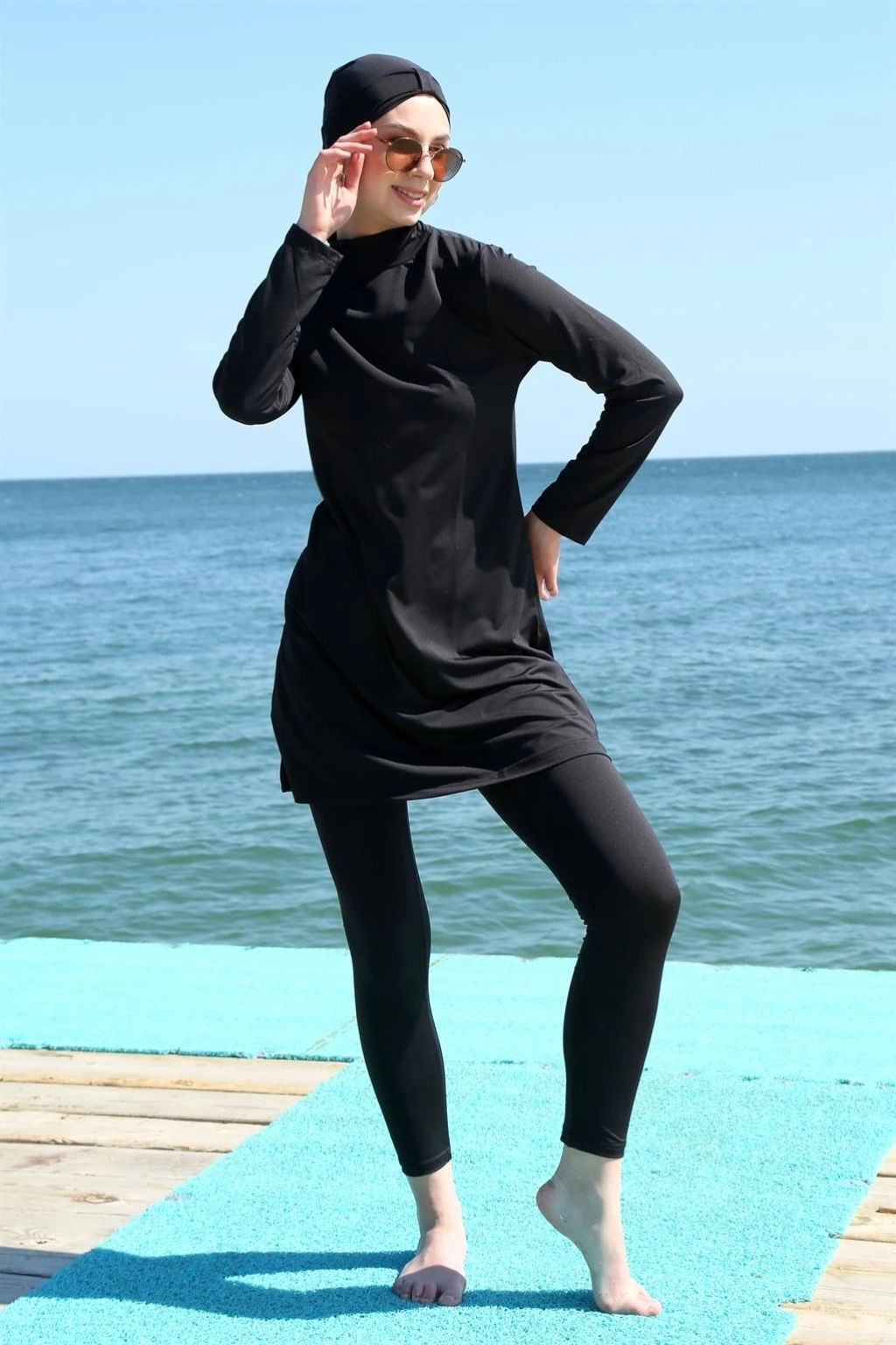 Uzun Kol Likralı Siyah Tesettür Mayo, hem şık hem de rahat bir plaj deneyimi için tercih edebileceğiniz bir parçadır.