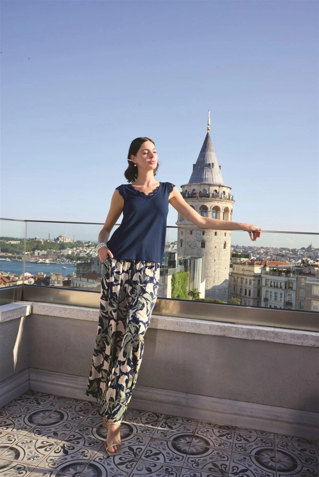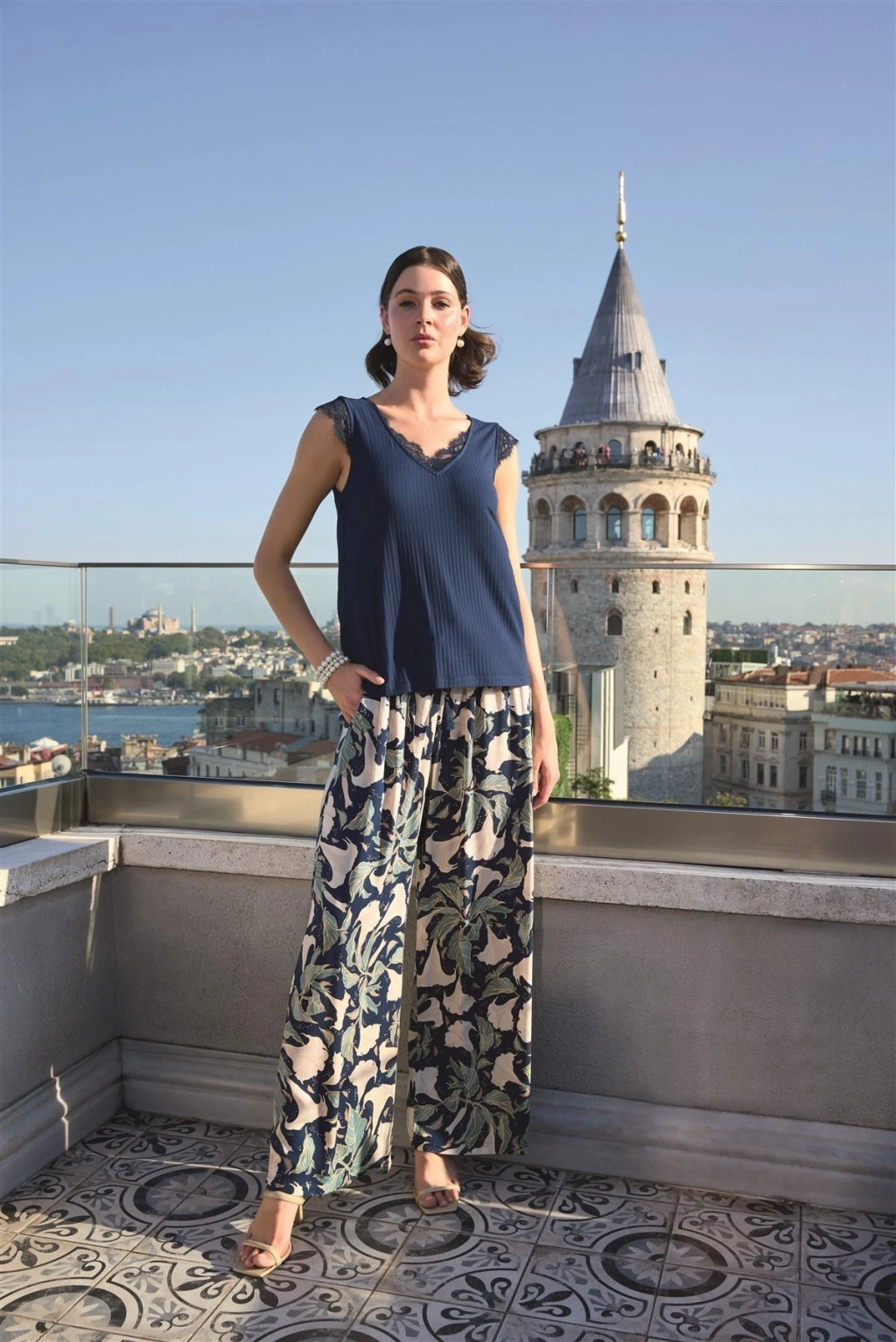 Yaprak Desenli Ve Dantelli 3'lü Pijama Takımı