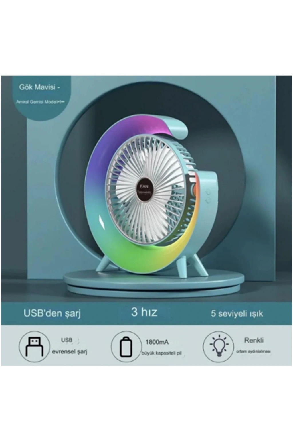 • Masaüstü Vantilatör Usb Şarjlı Rgb Led Işıklı 3 Kademeli 180° Ayarlanabilir Soğutucu Fan Mavi