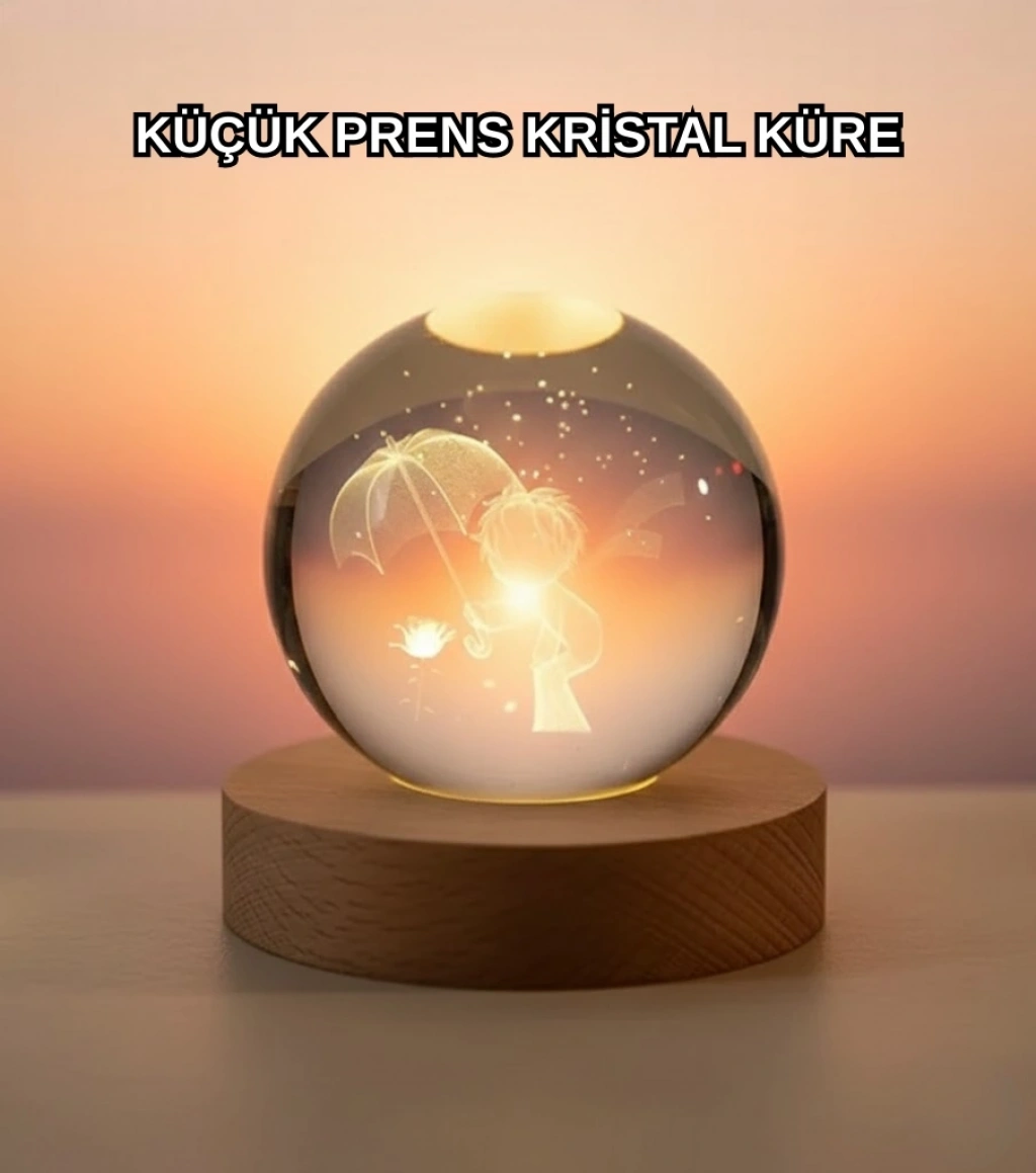 Küçük Prens Kristal Küre Gece Lambası, yüksek kalite kristal cam ve dayanıklı ahşap taban ile üretilmiştir. 3000K sıcak ışık rengi ile hem dinlendirici hem es bir ortam oluşturur. Kürenin içindeki desen gelişmiş 3D lazer oymadır, zamanla bozulmaz ve netliğini korur.Ambalaj boyutu 12×8.5×8 cm olup taşınabilir ve kompakt bir tasarıma sahiptir. USB bağlantılı olması sayesinde kolay kullanım ve düşük enerji tüketimi sağlar. Açma–kapama düğmesi ile kullanım son derece rahattır.