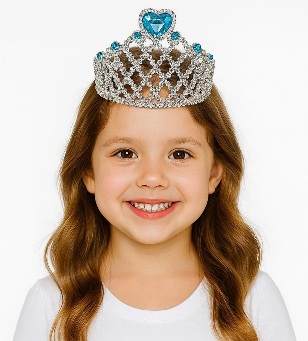 Bu taç, gümüş renginde ve mavi kalp süslemesi ile zarif ve modern bir tasarıma sahiptir. Taçtaki parıldayan taşlar ise masalsı bir atmosfer yaratarak küçük prensesinizin göz kamaştırmasını sağlayacaktır.