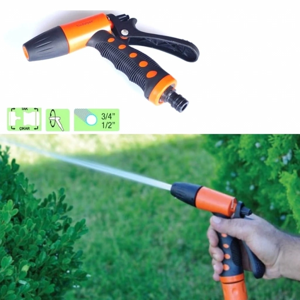Otomatik tabanca ayarlanabilen aksesuarı ile Sis, Yağmurlama, tazyikli sulama yapmaktadır.