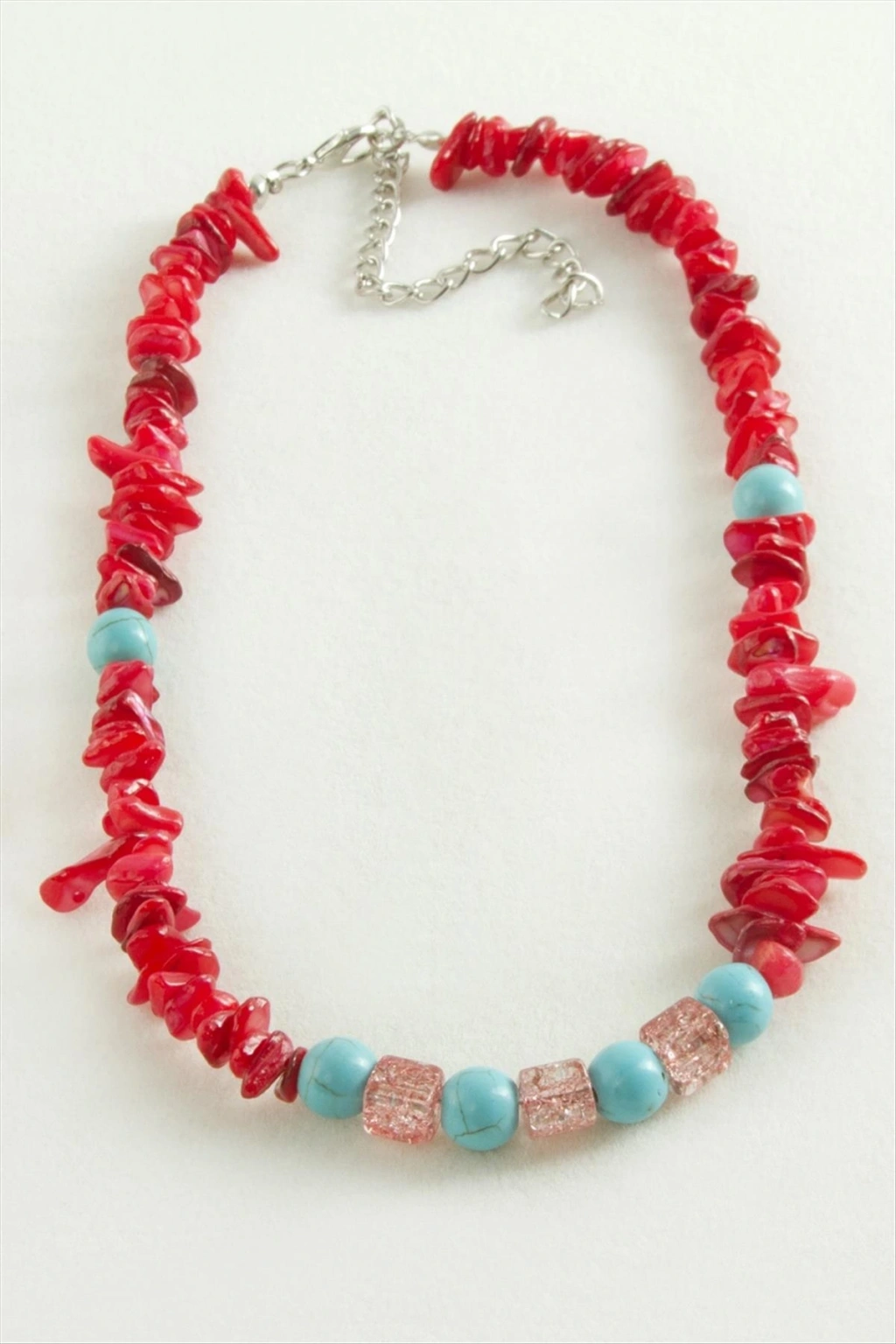 Kolye; Ürün malzemesi mercan ve necef doğaltaştır. Ürün boyu 40 cmdir. 6 mm doğaltaş kullanılmıştır.