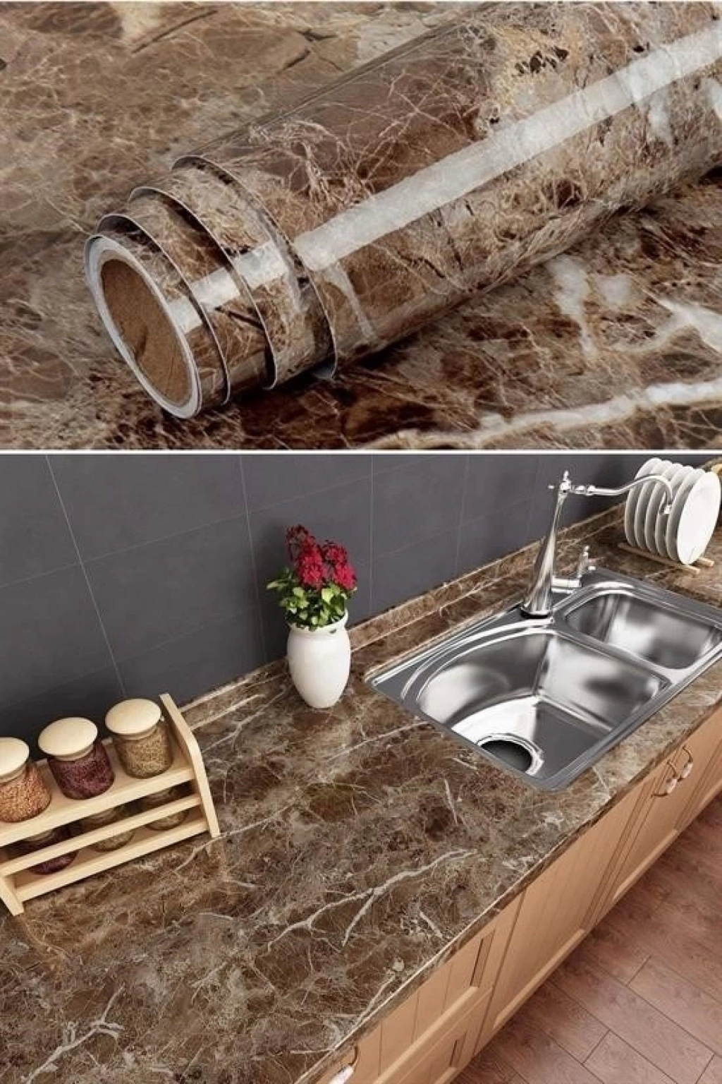 • Mermer Desenli Masa Tezgah Mutfak Su Geçirmez Yapışkanlı Folyo Sticker Kahverengi 5x0,6m
