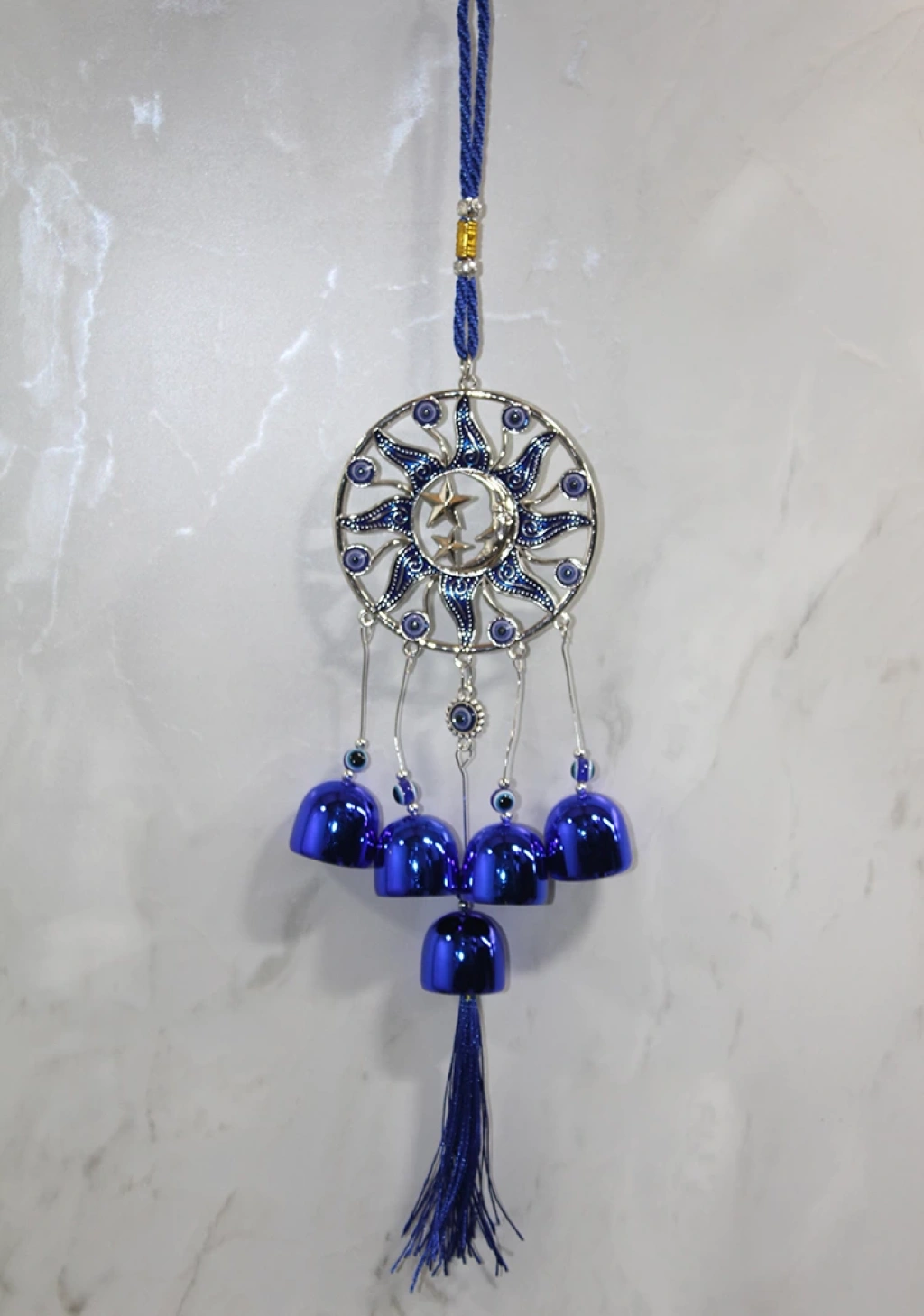 METAL NAZAR BONCUĞU ÇAN MODEL 16Ürün ÖzellikleriMetal Nazar Boncuğu Çan Model 16, geleneksel nazar boncuğu motifleriyle süslenmiş şık ve mistik bir dekor ürünüdür. Rüzgarla birlikte hareket eden metal çanları, huzurlu bir melodi yayarak ortamda sakinleştirici bir etki oluşturur. Nazar boncuğu detayları sayesinde kötü enerjilere karşı koruma sağladığına inanılır. Balkon, kapı, pencere veya iç mekan süslemesi için ideal bir seçimdir. Dekoratif ve anlamlı tasarımıyla her ortama otantik bir hava katmaktadır.Paket İçeriği1 Adet Metal Nazar Boncuğu Çan