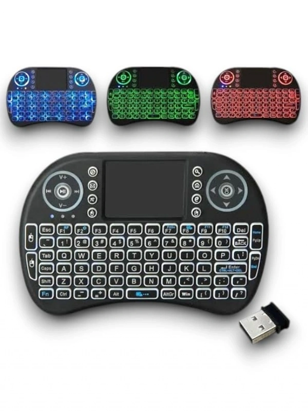 Mini Klavye Işıklı Kablosuz Mini Klavye SmartTV Televizyon PS3 Dokunmatik Mouse Mini Kablosuz Dokunmatik Klavye Mouse 3 Renk olarak klavye ışıklıdır. Işığını açmak için FN + F2 tuşuna basarak renkler arasında geçiş yapabilirsiniz. Bilgisayarınıza, akıllı telefonunuza, tabletinize, televizyonunuza bağlanır. Ufacık boyutu ile yanınızda her yere taşıyabilirsiniz. Kullanımı kolaydır, kaliteli plastikten üretilmiştir. Sadece siyah mevcuttur. 2.4 GHz kablosuz bağlantı ile 10 metreye kadar kullanılabilir. Ürün Pillidir Dahili bataryası içinde mevcuttur. Windows, Android, Mac, Linux destekler PS3, XBOX360 destekler Özellikleri Voltaj: 3.3 V Çalışma akımı: 50mA Frekans: 2.4 GHz Kullanım mesafesi: 10 metreye kadar Ağırlık: 92gr (pilsiz) Boyutları: 14.7x9.8x2cm Kutu İçeriği 1 adet mini klavye 1 adet kullanım klavuzu 1 adet USB verici (klavyenin pil girişinin içindedir.)Kutu İçeriği 1 adet mini klavye 1 adet kullanım klavuzu 1 adet USB verici (klavyenin pil girişinin içindedir.)