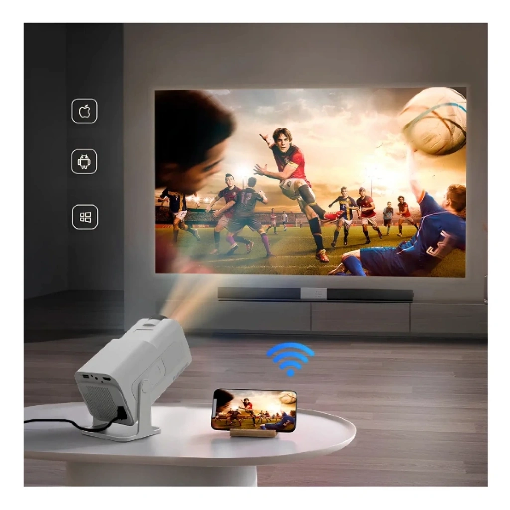 MİNİ TAŞINABİLİR PROJEKSİYON Ürün ÖzellikleriEvde, ofiste veya açık havada sinema keyfini yaşamak isteyenler için tasarlanan Mini Taşınabilir Projeksiyon, güçlü performansı ve şık kompakt tasarımıyla dikkat çekiyor. 150 inçe kadar dev ekran yansıtma özelliği sayesinde gerçek sinema deneyimini her ortamda yaşamanıza olanak tanır.Full HD 1080P çözünürlüğün yanı sıra 4K Ultra HD destekli bu akıllı projektör, 220 ANSI lümen parlaklık değeriyle son derece net, canlı ve kontrastı yüksek görüntüler sunar. Dahili Android sistemi, Netflix, YouTube ve 400’den fazla uygulamaya doğrudan erişim imkânı sağlar. Bluetooth ve Wi-Fi bağlantısı sayesinde kablosuz kullanım kolaylığı sunarken, tüm Android ve iOS cihazlarla tam uyumluluk gösterir.1GB RAM + 8GB dahili hafıza donanımıyla akıcı bir performans sunar ve film, sunum veya oyun deneyiminde kesintisiz bir kullanım sağlar. Dahili hoparlör, yüksek ses kalitesiyle ek ses sistemine ihtiyaç duymadan güçlü bir ses deneyimi yaşatır. 180° dönebilen başlığı, cihazı istediğiniz açıdan kolayca konumlandırmanızı sağlar.Kompakt yapısı ve kolay taşınabilirliğiyle iş toplantılarında, seyahatlerde veya ev sineması kurulumlarında ideal bir seçimdir.Paket İçeriği1 adet Mini Taşınabilir Projeksiyon
