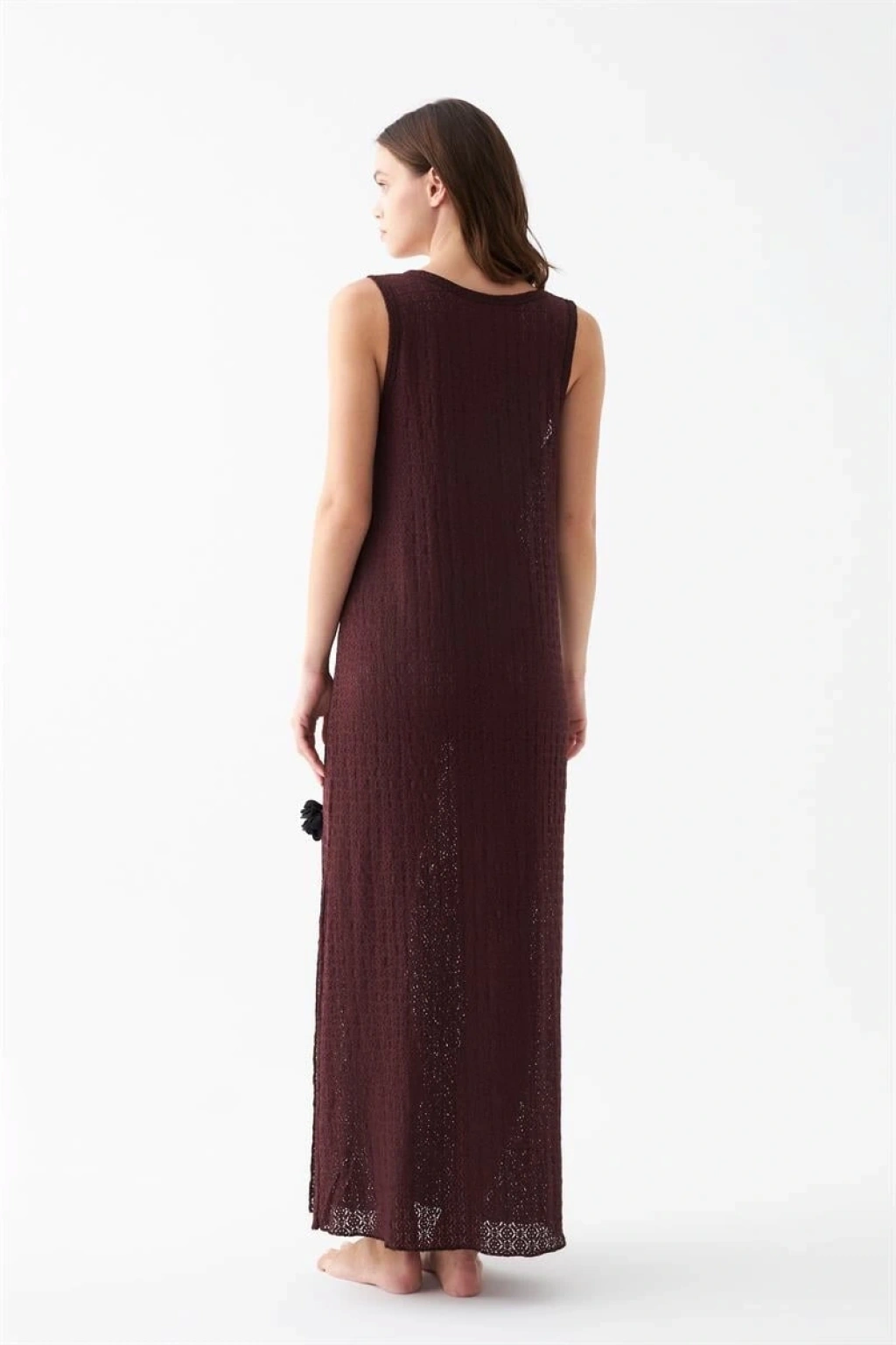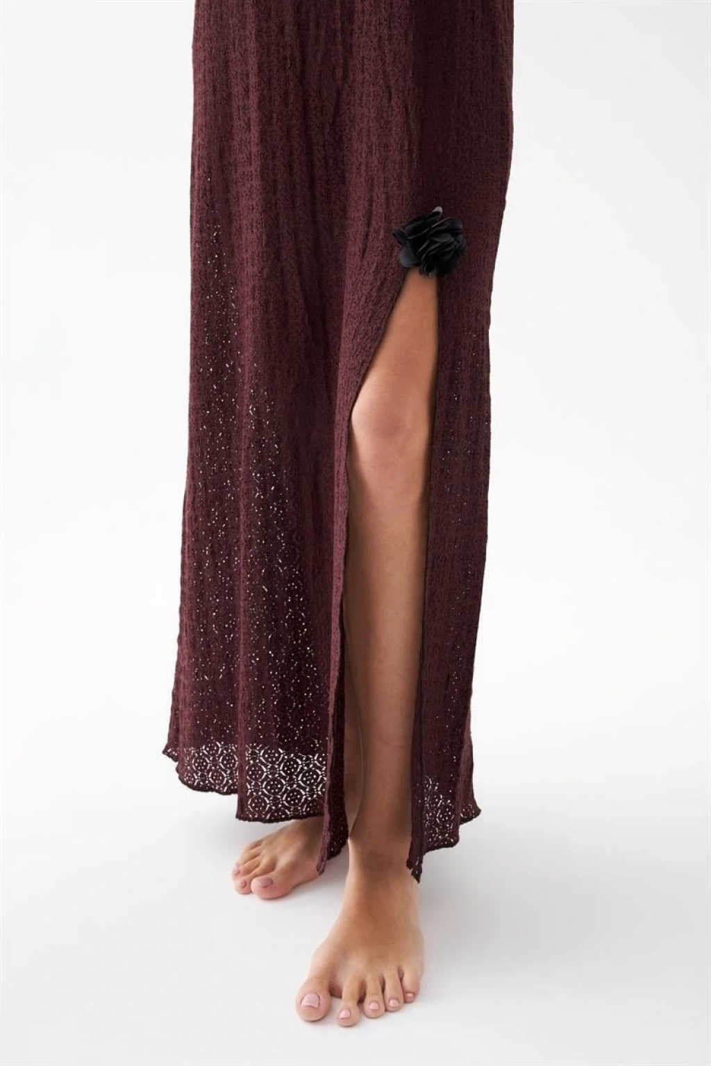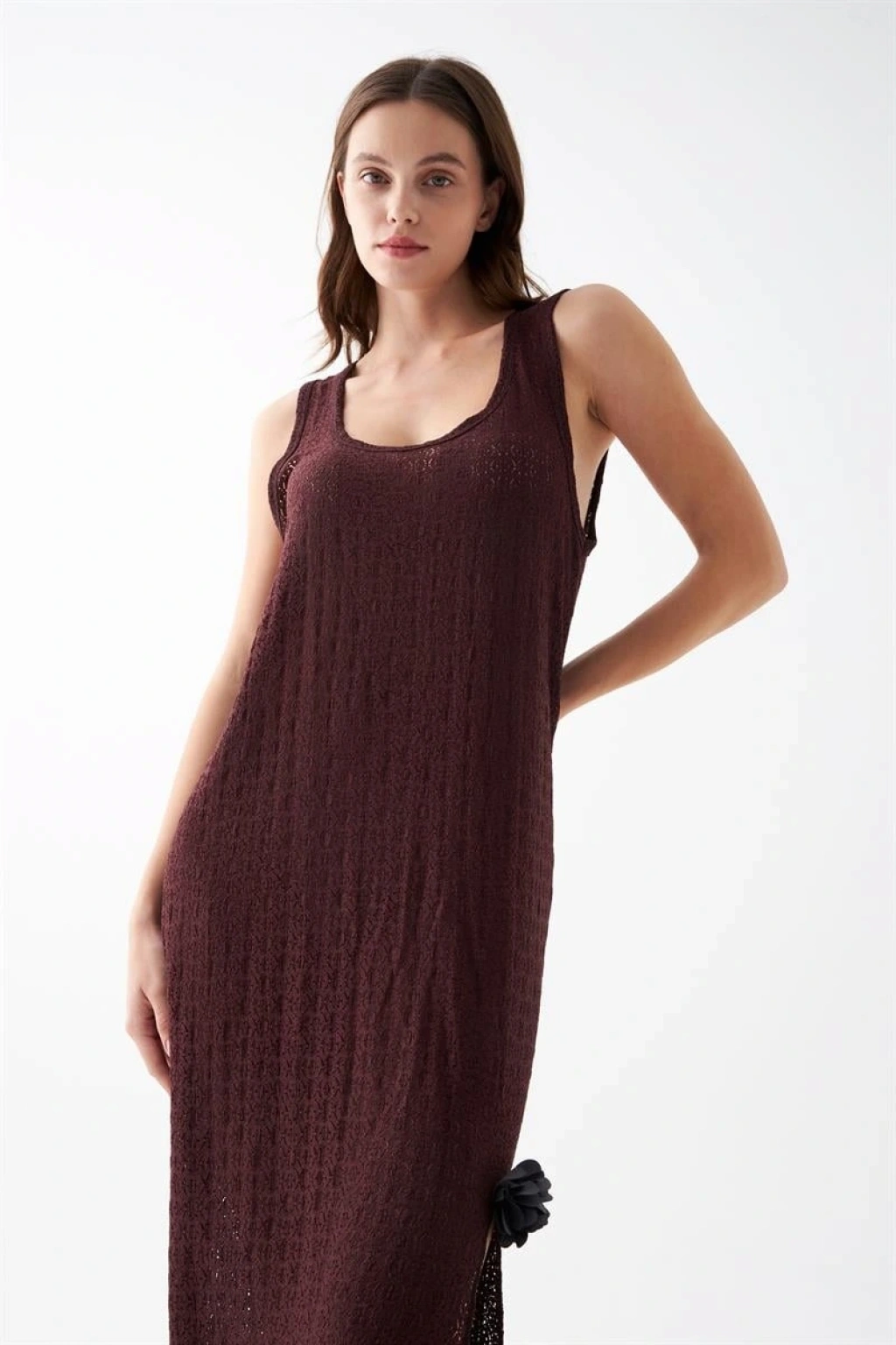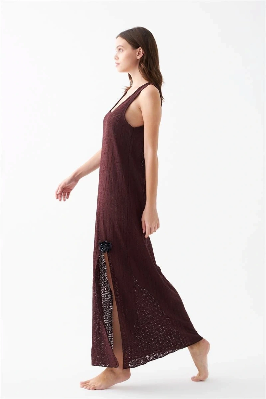 Dantel dokulu yüzeyi ürüne feminen bir görünüm katarken yan yırtmaç detayı hareket kolaylığı sağlayarak kullanım konforunu artırır. Mürdüm rengin asil ve zarif tonu gecelik tasarımına modern bir şıklık kazandırır.