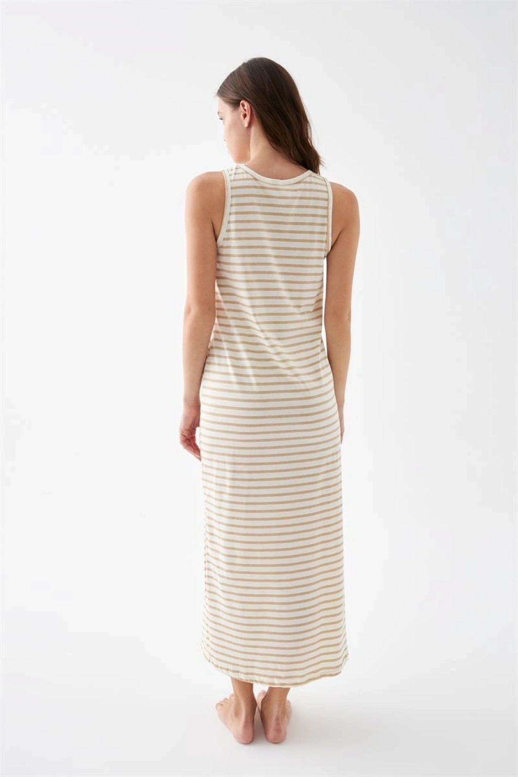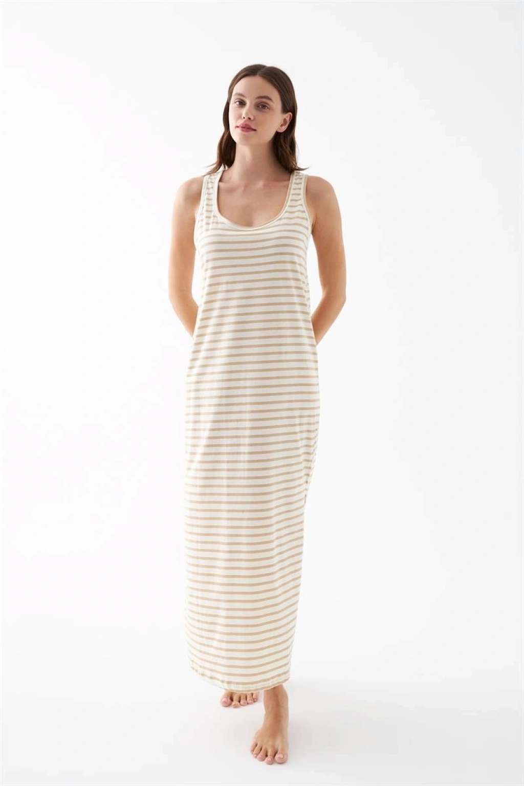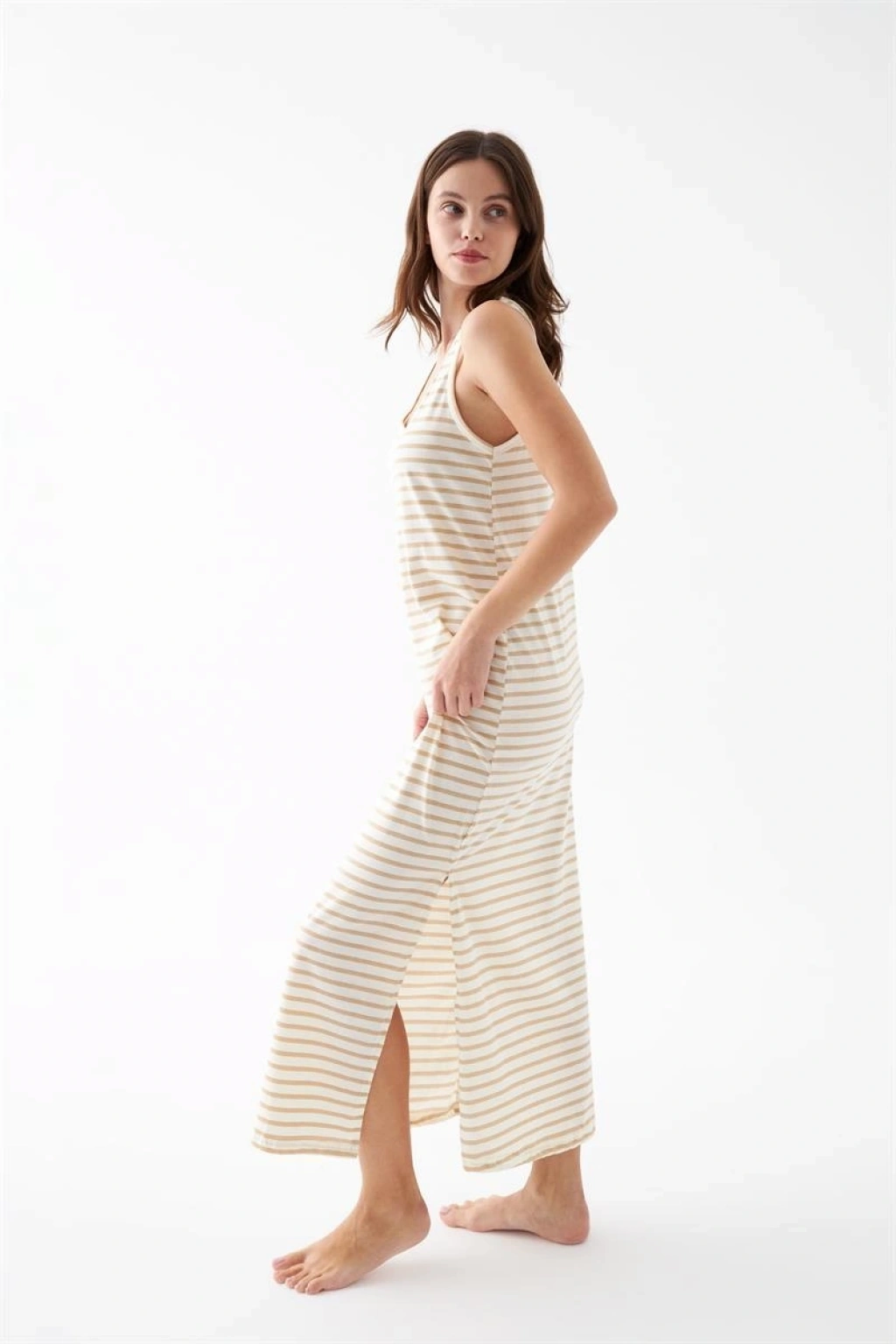Rahatlığı ve sade şıklığı bir arada sunan Kadın Sarı Çizgili Askılı Uzun Gecelik, hafif kumaş yapısı sayesinde gece boyunca konforlu bir kullanım sağlar. İnce askılı tasarımı hareket özgürlüğü sunarken uzun kesimi vücuda dengeli ve rahat bir duruş kazandırır.