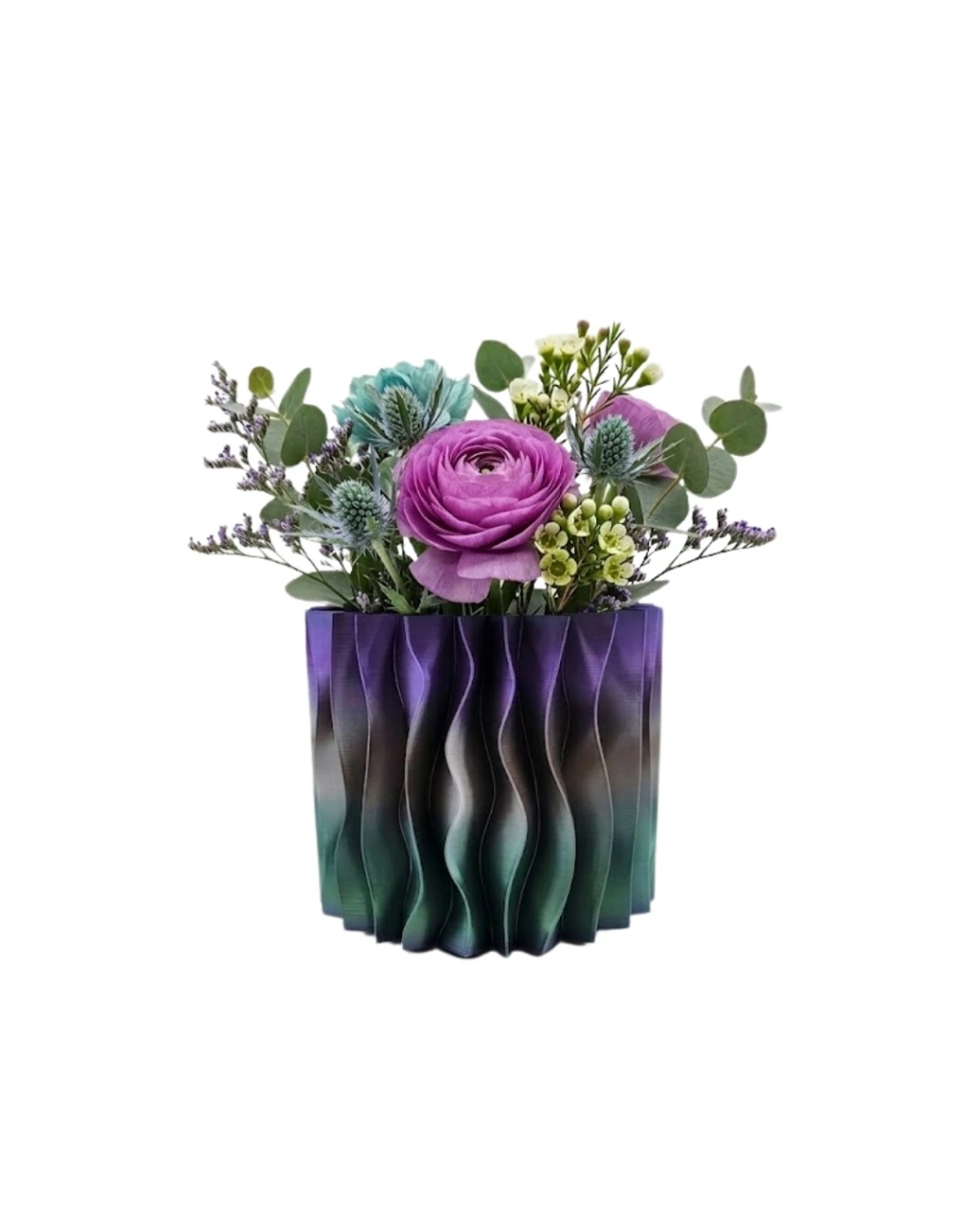Modern dalgalı tasarımlı mor 3D dekoratif vazo, es görünümü ve özgün tasarımı ile yaşam alanlarında dikkat çeken dekoratif ürünlerden biridir. Dalga formunda tasarlanan yüzey yapısı sayesinde klasik vazolardan farklı bir görünüm sunar. Bu özgün tasarım hem modern hem de sanatsal dekorasyon anlayışını yansıtan es bir form oluşturur. Mor renk tonlarının oluşturduğu şık görünüm ise ürüne zarif ve dikkat çekici bir karakter kazandırır.3D baskı teknolojisi kullanılarak üretilen bu dekoratif vazo, dalgalı yüzey formu ve modern geometrik tasarımı sayesinde oldukça es bir görünüm sunar. Ürünün yüzeyindeki dalga formu ışık ile farklı açılarda farklı gölgeler oluşturarak dekoratif bir derinlik hissi yaratır. Bu özellik sayesinde bulunduğu ortamda dikkat çekici bir dekoratif obje olarak öne çıkar.Mor renk tonları dekorasyon dünyasında zarafet, modernlik ve es ile ilişkilendirilen renkler arasında yer alır. Bu nedenle mor dekoratif vazo modern ev dekorasyonlarında, minimalist dekorasyon stillerinde ve sanatsal dekorasyon konseptlerinde oldukça uyumlu bir kullanım sunar.Dekoratif mor 3D vazo özellikle kuru çiçekler, dekoratif dallar veya küçük bitkiler ile birlikte kullanıldığında oldukça şık bir görünüm oluşturur. Bunun dışında masa dekoru, raf dekoru veya sehpa üzerinde dekoratif obje olarak da kullanılabilir.Salon, çalışma odası, kitaplık, televizyon ünitesi veya ofis masası üzerinde kullanıldığında bulunduğu ortama modern ve es bir atmosfer kazandırır. Minimalist dekorasyon, modern dekorasyon veya bohem dekorasyon stilleri ile uyum sağlayabilecek bir tasarıma sahiptir.Modern dalgalı tasarımlı mor 3D dekoratif vazo aynı zamanda dekoratif hediye arayanlar için de oldukça özel bir alternatiftir. Ev hediyesi, yeni ev hediyesi veya ofis hediyesi olarak tercih edilebilir.Es tasarımı, modern görünümü ve sanatsal formu sayesinde bu dekoratif vazo yaşam alanlarında şık ve dikkat çekici bir dekoratif aksesuar olarak öne çıkar.