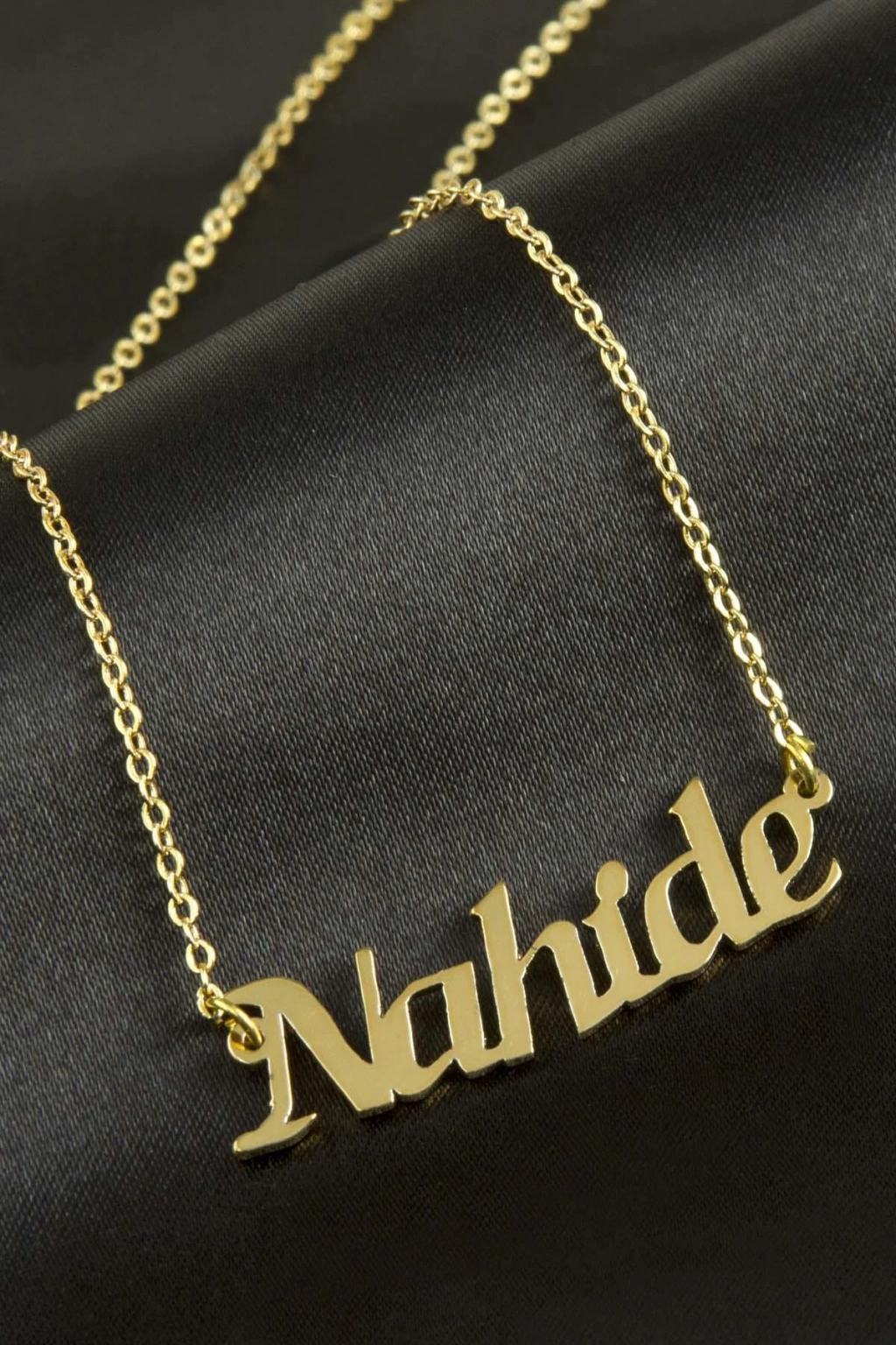Nahide isimli kolye. İsimli kolye pirinç madeninden ve altın kaplamalıdır. Kişiye özel üretilmektedir.Yazdırmak istediğiniz ismi bize mesaj olarak iletmeniz gerekmektedir. Kullanıma bağlı olarak uzun süre kullanıma uygundur. Ürün malzemesi 1.sınıf kalitededir. Ürün ve zinciri sarı renktedir. Ürün zincir boyu 45 cm ve ürün üzerindeki isimler yaklaşık 3 cmdir. İsim boyları ürün ismine göre degişiklik göstermektedir.