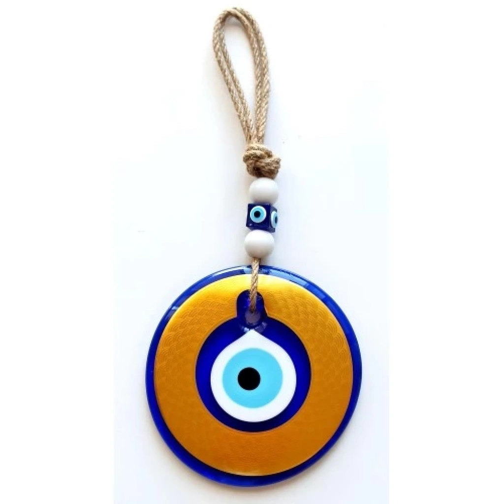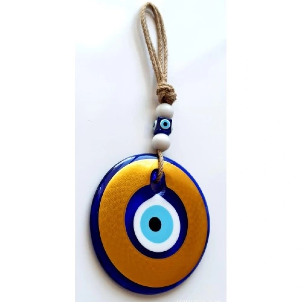 Altın rengi kaplamalı duvar süsümüz nazar boncuğu ile süslenmiştir. Ürünümüz mavi cam nazar boncuğundan tamamen el işçiliği ile üretilmiştir. Ürünümüzün yuvarlak kısmı 13 santimetre çapındadır. Duvar süsümüz ip dahil yaklaşık 30 santimetre boyundadır.