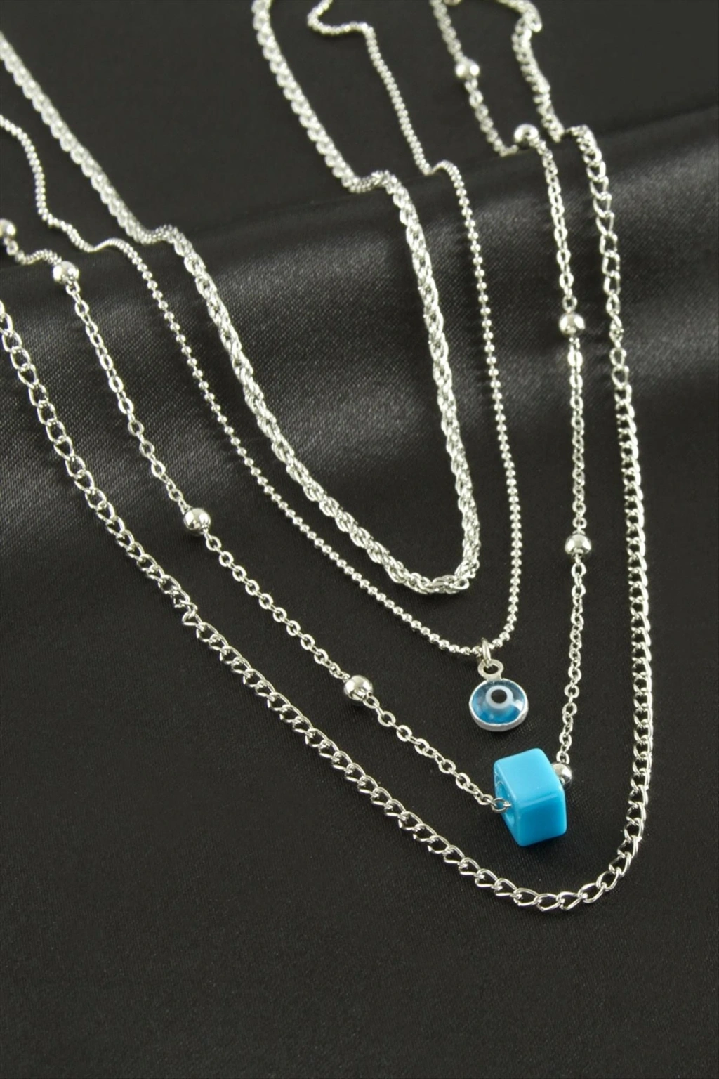 Kolye; Ürün malzemesi cam boncuk ve metaldir. Ürün zincir uzunluğu 60 cmdir. Kartlı ve paketiyle beraber gönderilecektir. 4 zincirden üretilmiştir.