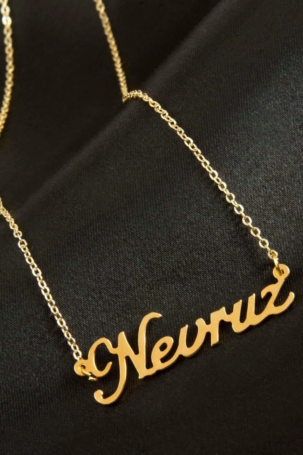 Nevruz İsimli Kolye. İsimli kolye pirinç madeninden ve altın kaplamalıdır. Kişiye özel üretilmektedir.Yazdırmak istediğiniz ismi bize mesaj olarak iletmeniz gerekmektedir. Kullanıma bağlı olarak uzun süre kullanıma uygundur. Ürün malzemesi 1.sınıf kalitededir. Ürün ve zinciri sarı renktedir. Ürün zincir boyu 45 cm ve ürün üzerindeki isimler yaklaşık 3 cmdir. İsim boyları ürün ismine göre degişiklik göstermektedir.