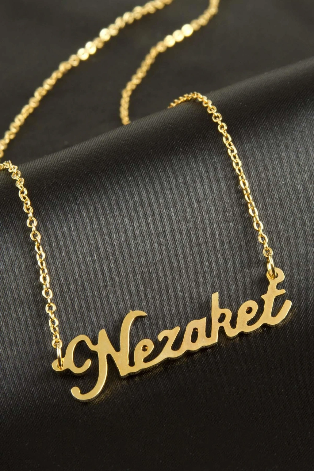Nezaket isimli kolye. İsimli kolye pirinç madeninden ve altın kaplamalıdır. Kişiye özel üretilmektedir.Yazdırmak istediğiniz ismi bize mesaj olarak iletmeniz gerekmektedir. Kullanıma bağlı olarak uzun süre kullanıma uygundur. Ürün malzemesi 1.sınıf kalitededir. Ürün ve zinciri sarı renktedir. Ürün zincir boyu 45 cm ve ürün üzerindeki isimler yaklaşık 3 cmdir. İsim boyları ürün ismine göre degişiklik göstermektedir.