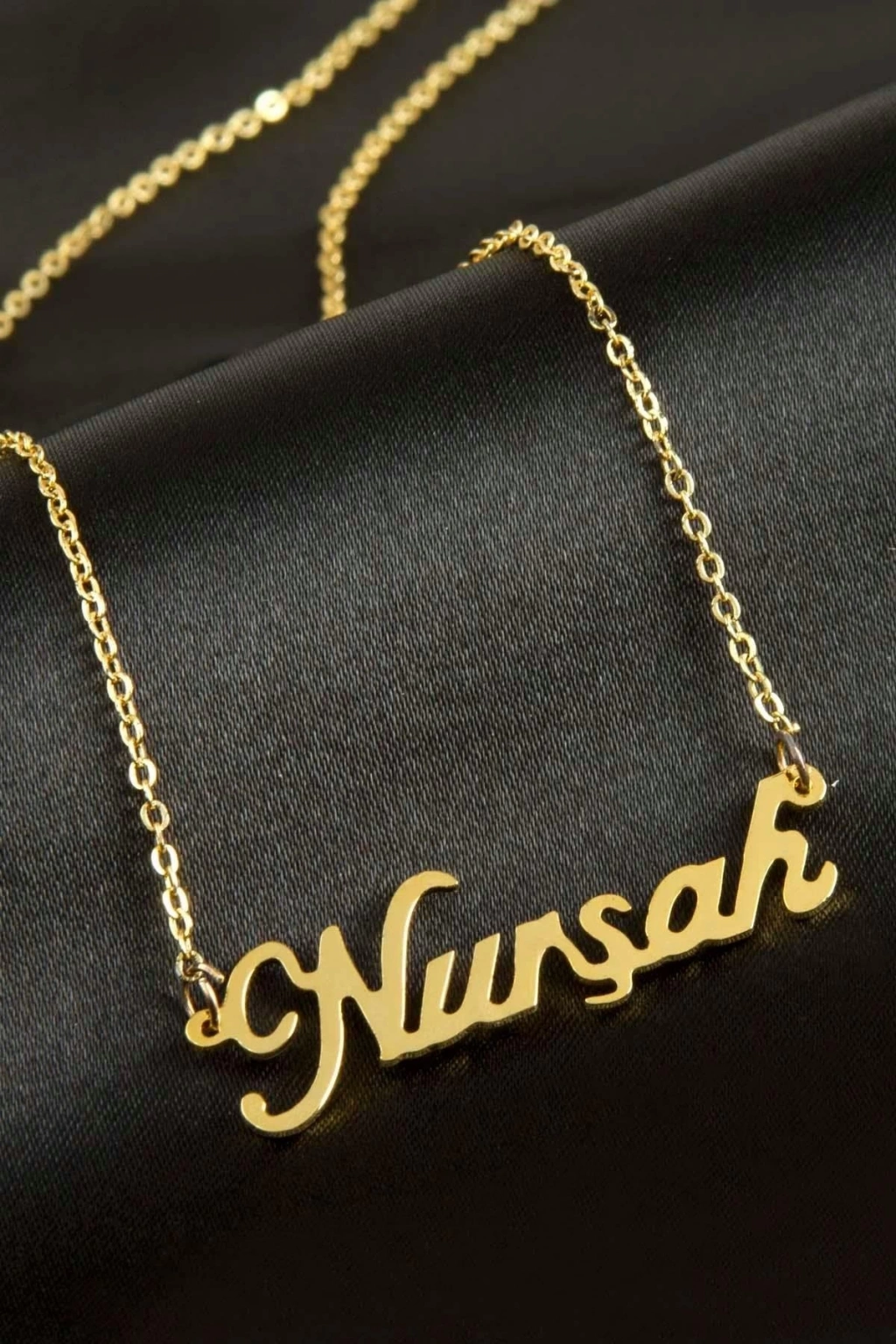 Nurşah İsimli Kolye. İsimli kolye pirinç madeninden ve altın kaplamalıdır. Kişiye özel üretilmektedir.Yazdırmak istediğiniz ismi bize mesaj olarak iletmeniz gerekmektedir. Kullanıma bağlı olarak uzun süre kullanıma uygundur. Ürün malzemesi 1.sınıf kalitededir. Ürün ve zinciri sarı renktedir. Ürün zincir boyu 45 cm ve ürün üzerindeki isimler yaklaşık 3 cmdir. İsim boyları ürün ismine göre degişiklik göstermektedir.