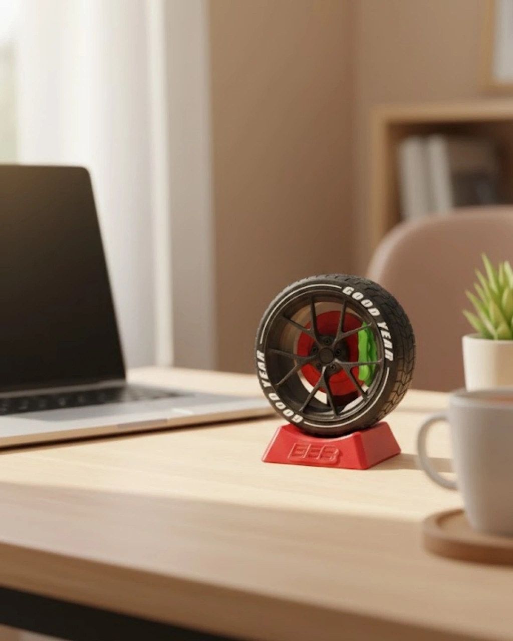 Dekoratif jant modeli, ofis ve çalışma alanlarında es bir dokunuş sağlar. Kompakt yapısı sayesinde her alana uyum sağlar ve masa üzerinde düzeni bozmaz. Dikkat çekici tasarımıyla ofis dekorasyonuna hareket katar. Spor ve modern tarzı bir araya getiren bu masa süsü, ofis ortamında farklı ve özgün bir aksesuar arayanlar için iyi bir seçenektir.
