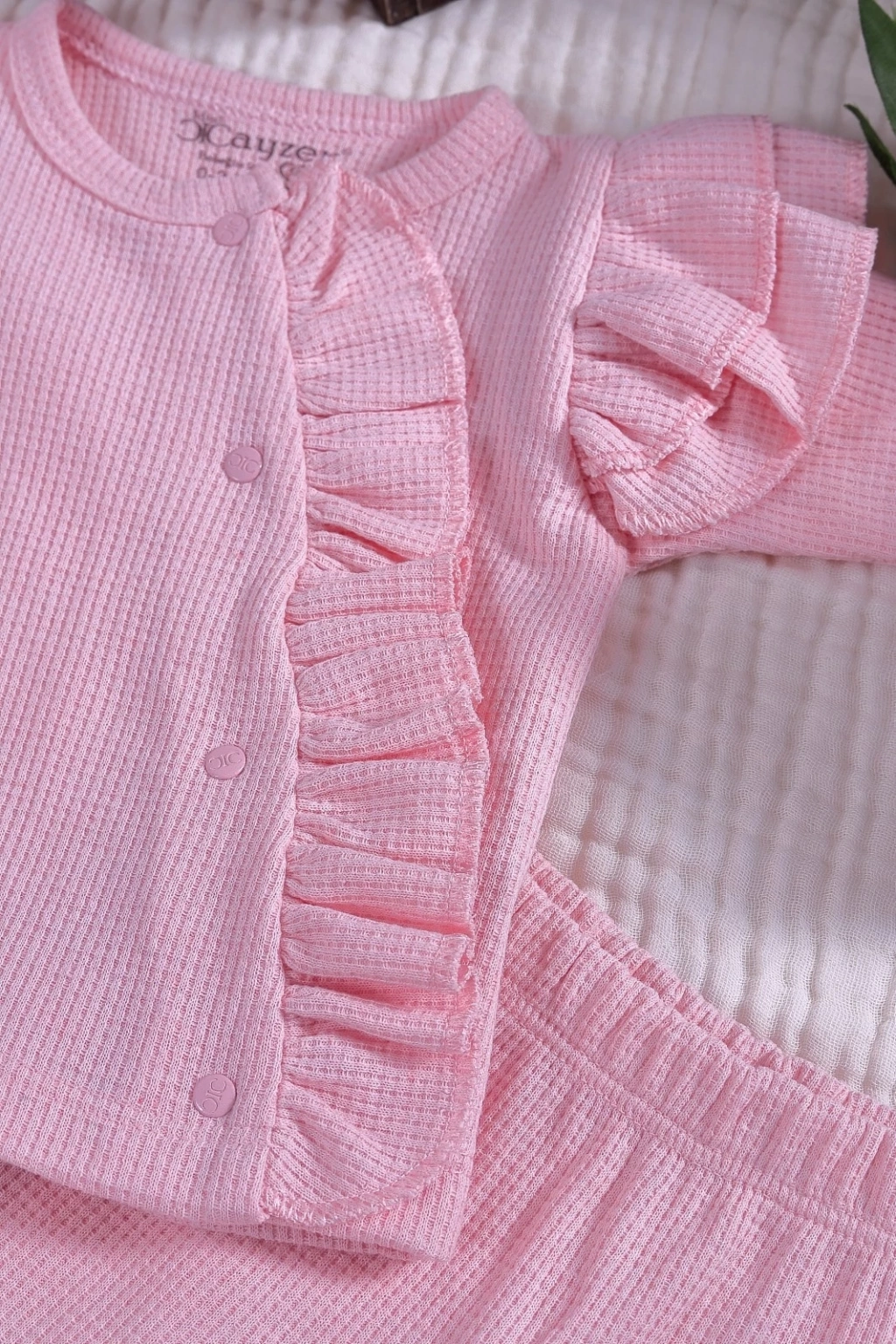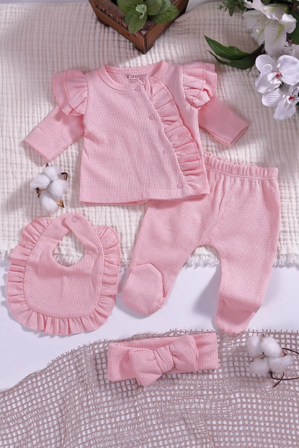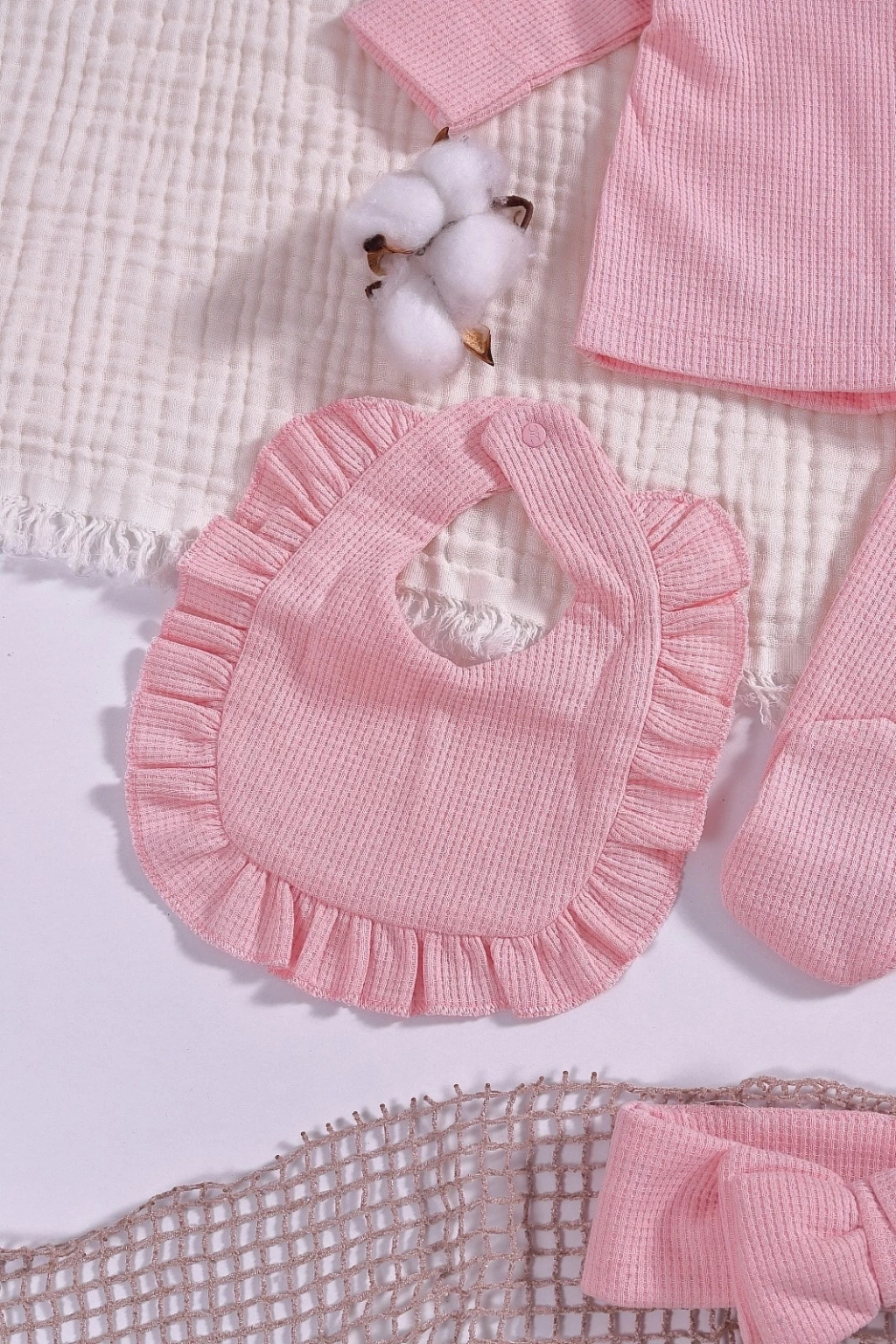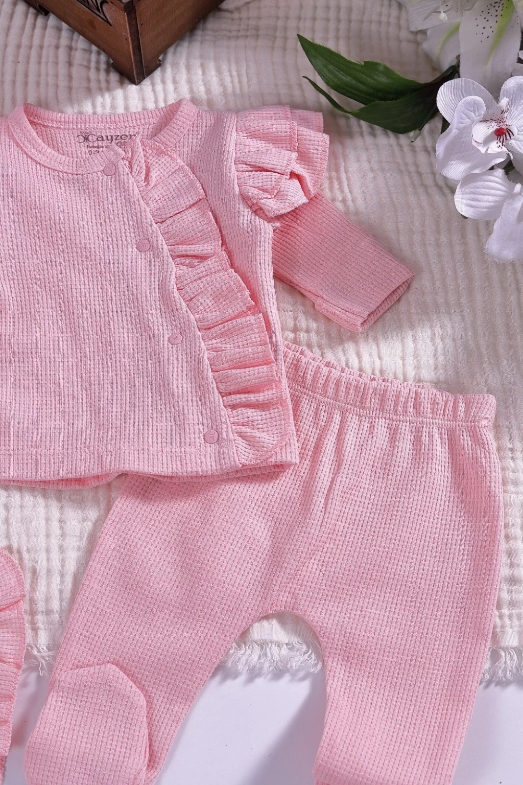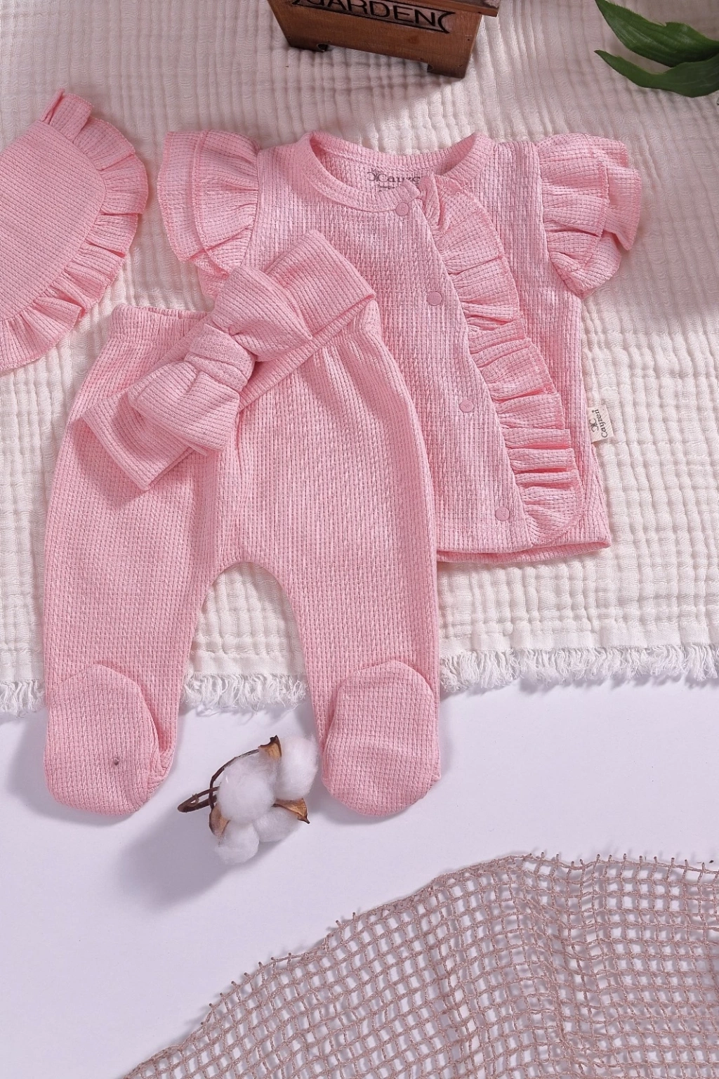 Babydonat markasının bebeğiniz için özel olarak tasarladığı Omuzdan Fırfır Detaylı 5 parça %100 Pamuk Kız Hastane Çıkışı setiyle bebeğiniz hastaneden ayrılırken şık ve konforlu hissedecek.
