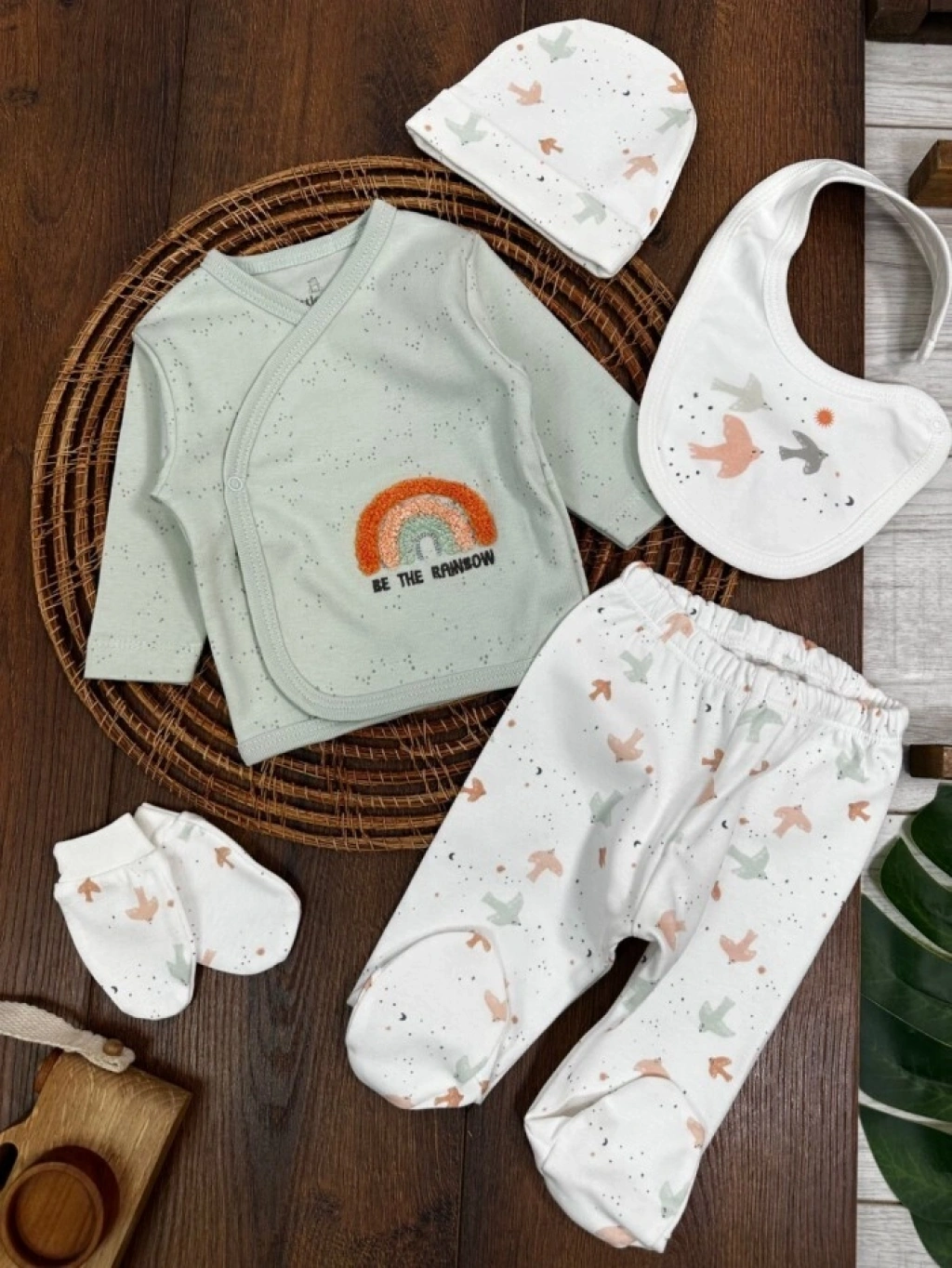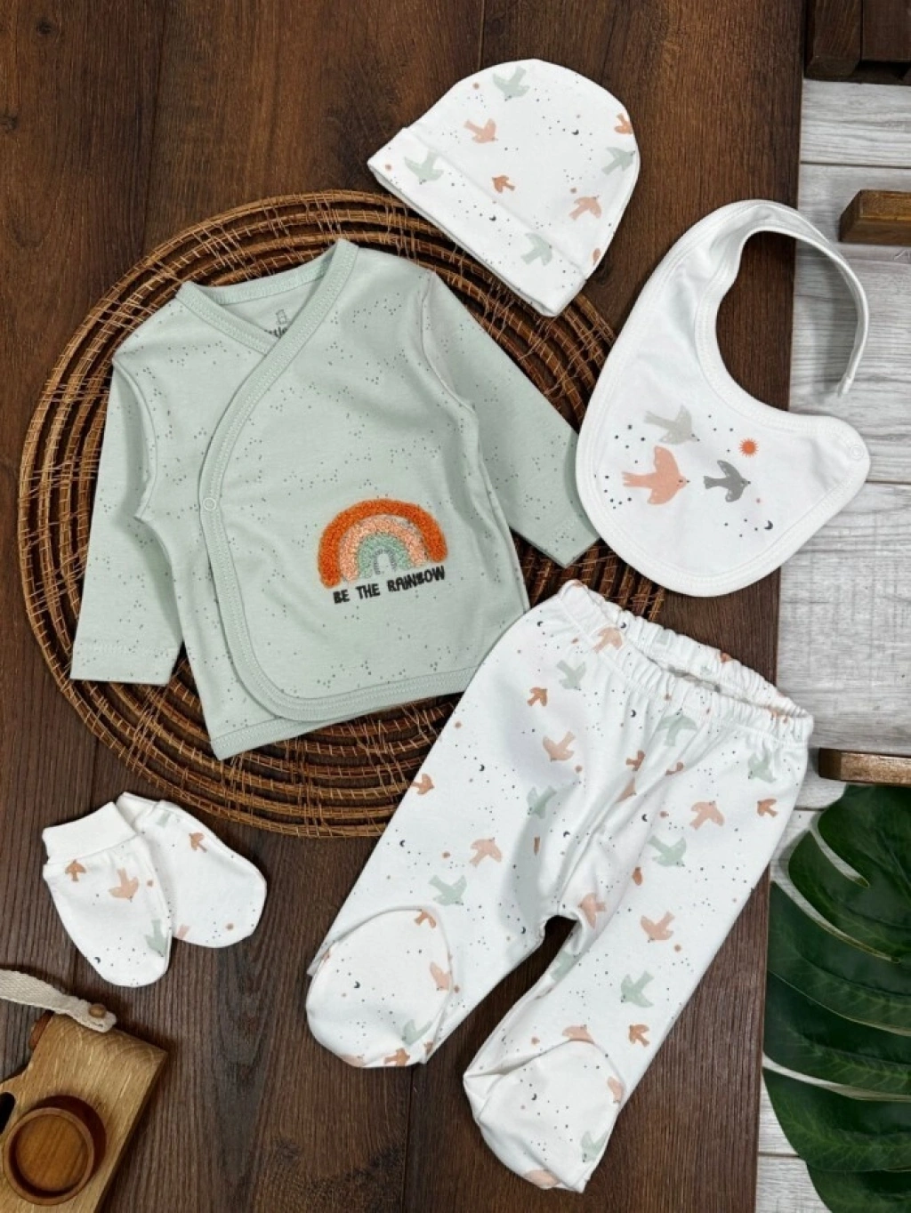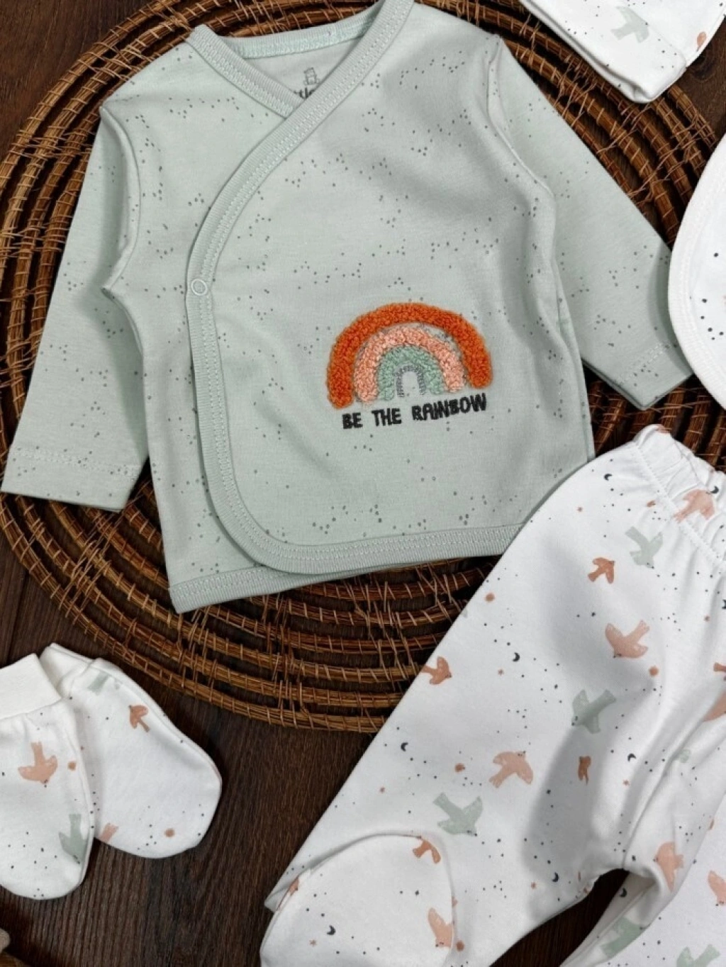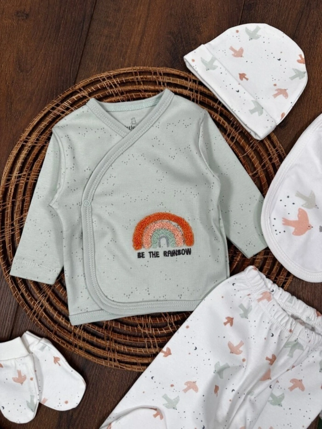 Organik Pamuklu Gökkuşagı Nakışlı Yenidoğan 5li Hastane Çıkışı Seti