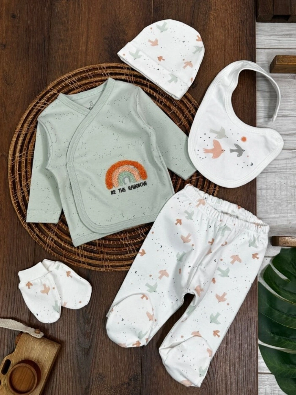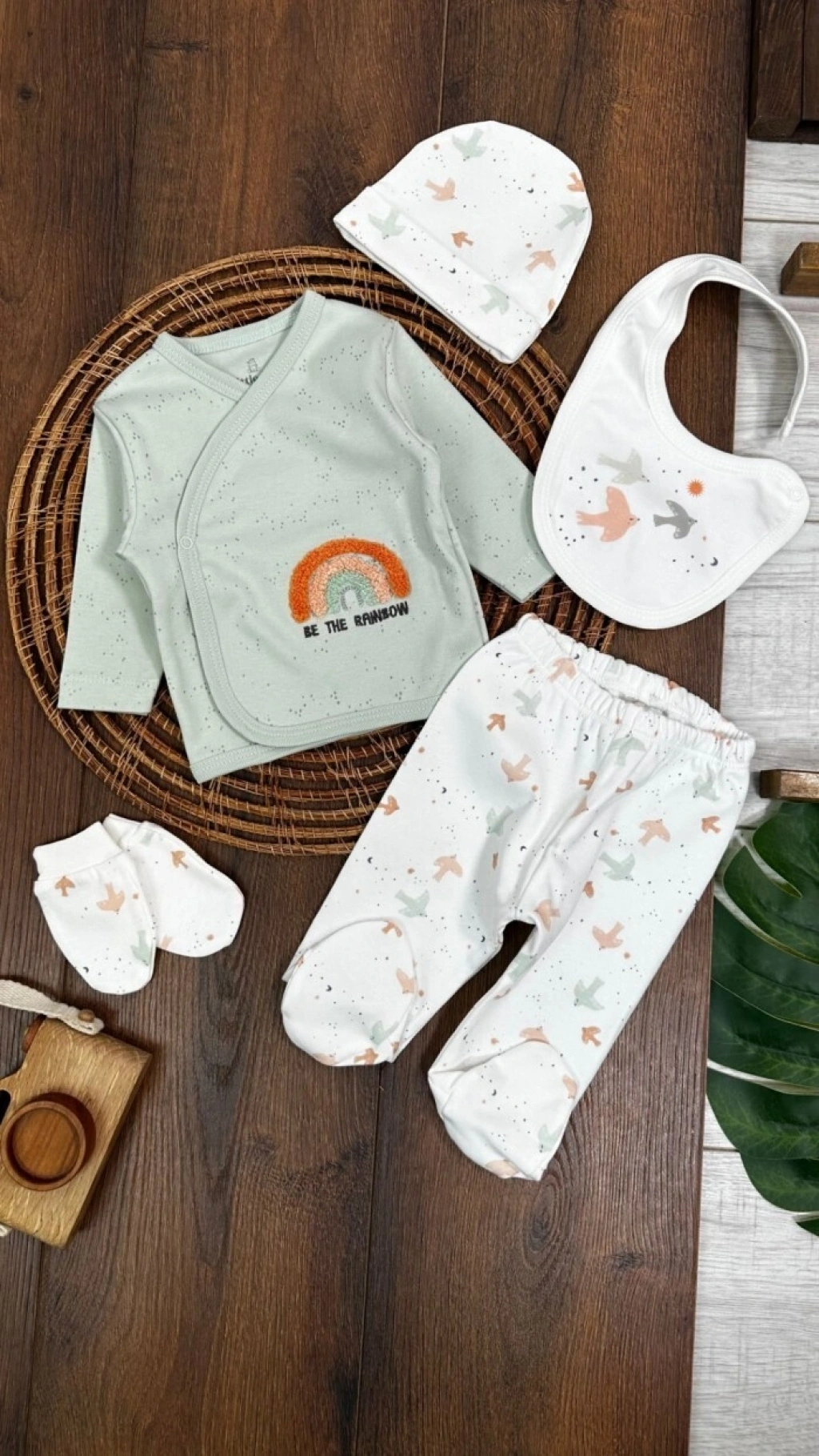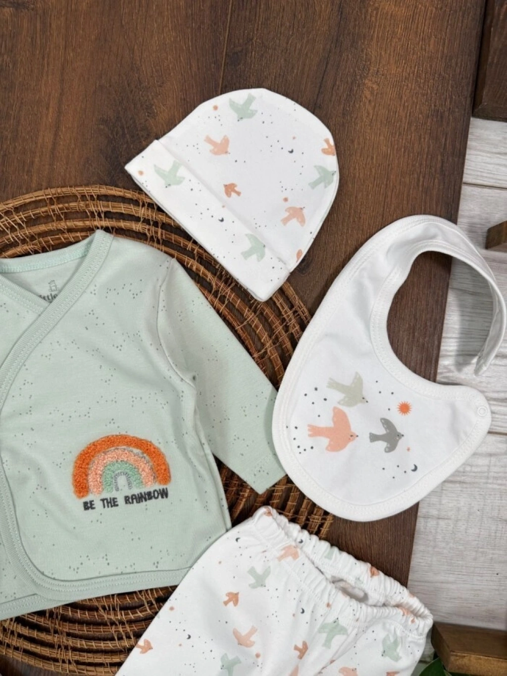 Organik Pamuklu Gökkuşagı Nakışlı Yenidoğan 5li Hastane Çıkışı Seti