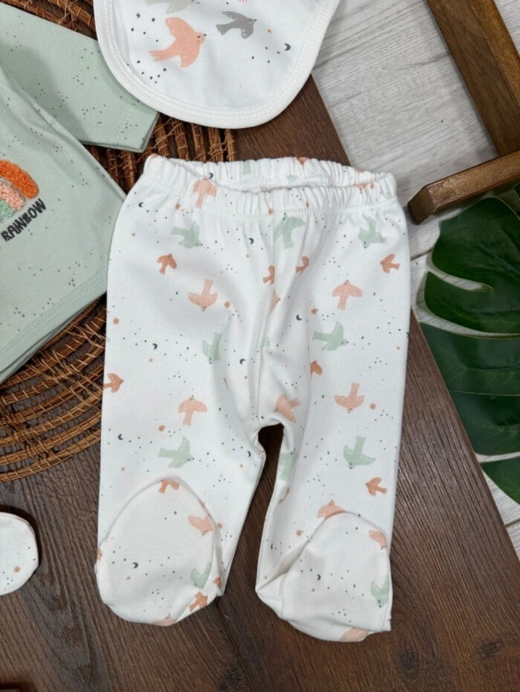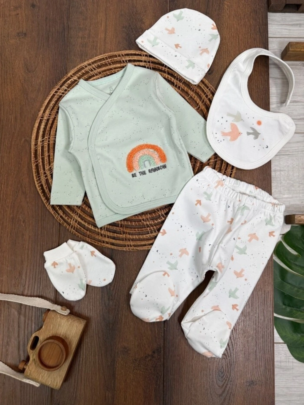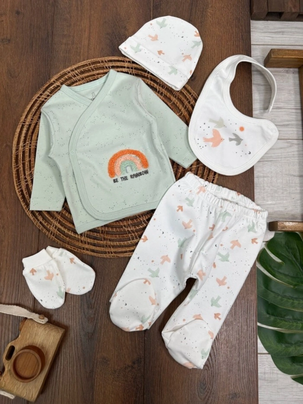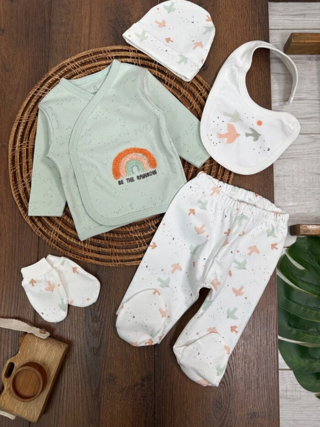 Organik Pamuklu Gökkuşagı Nakışlı Yenidoğan 5li Hastane Çıkışı Seti