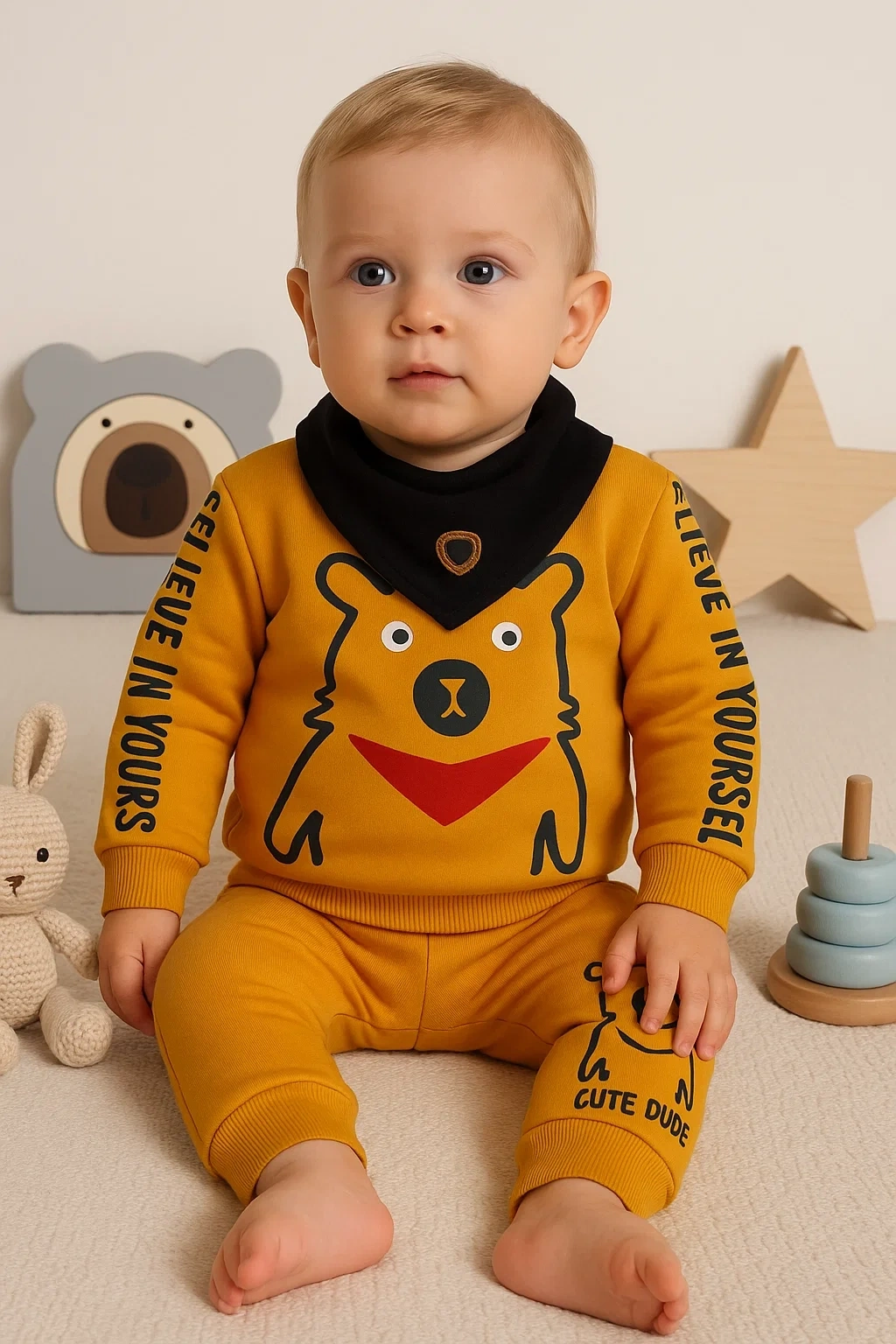 Oynar Gözlü Fularlı 3'lü Erkek Bebek Takımı