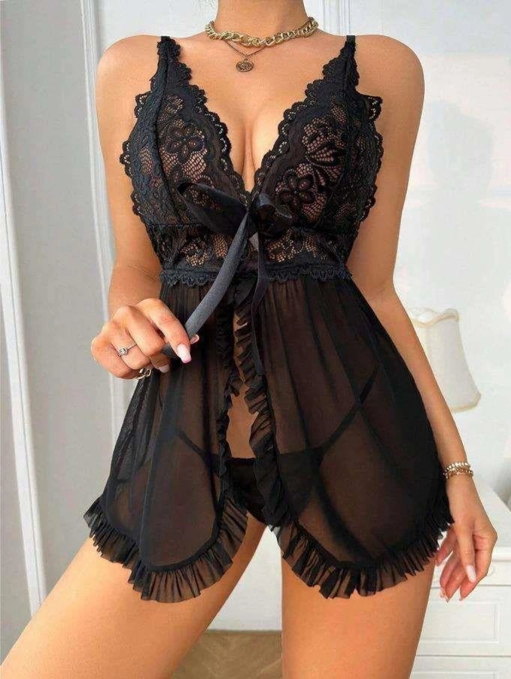 Özel Tasarım Siyah Dantel İşlemeli Yırtmaçlı Kurdelalı Tül Fantezi Şık Gecelik