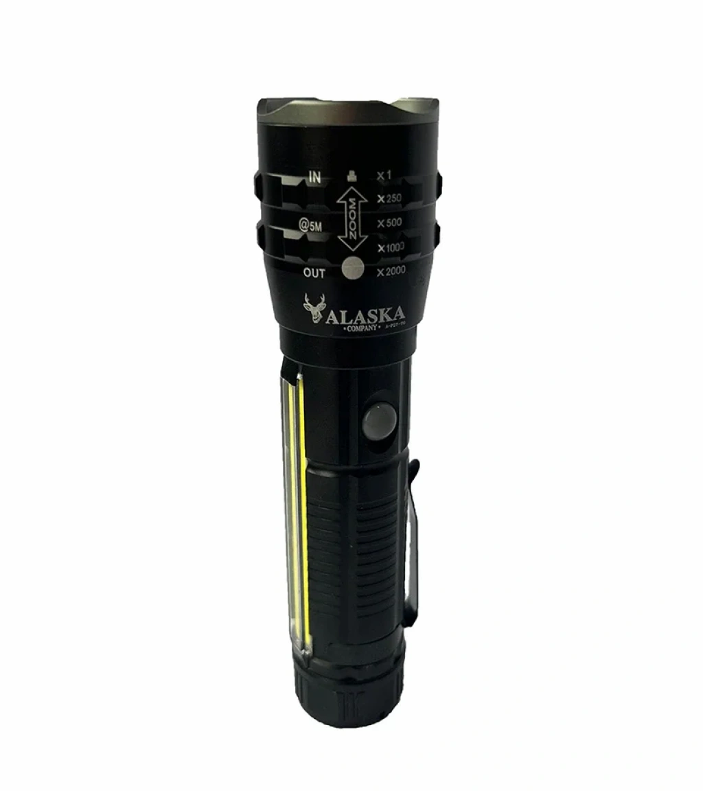 P27 şarjlı LED metal el feneri, hafif ve kompakt tasarımı, 1000 lümen ışık gücü ve yan COB LED aydınlatması ile çok amaçlı kullanabileceğiniz şarjlı el feneri modelidir.