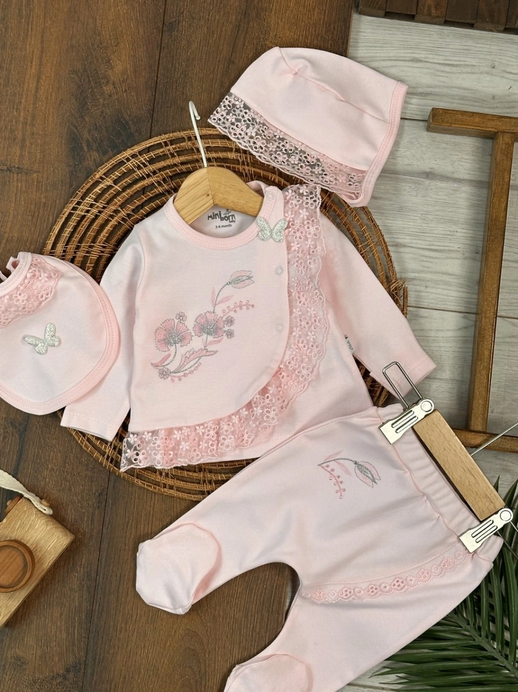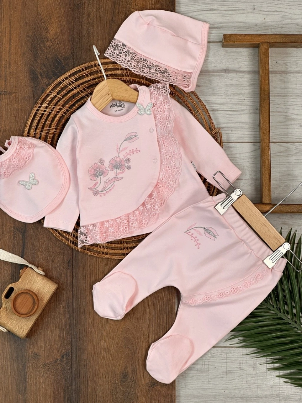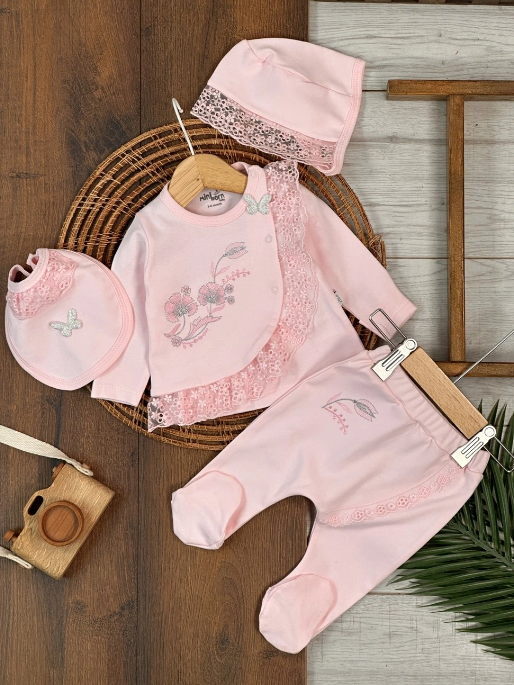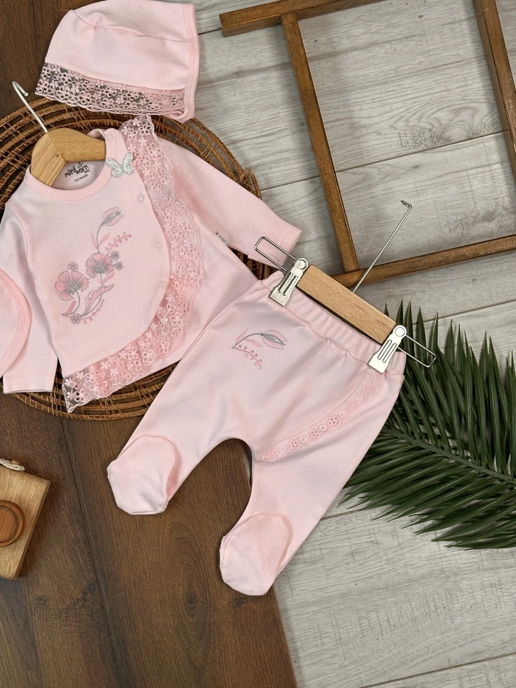 Pamuklu Çiçek Nakışlı Uzun Kollu Kız Bebek Hastane Çıkış Seti