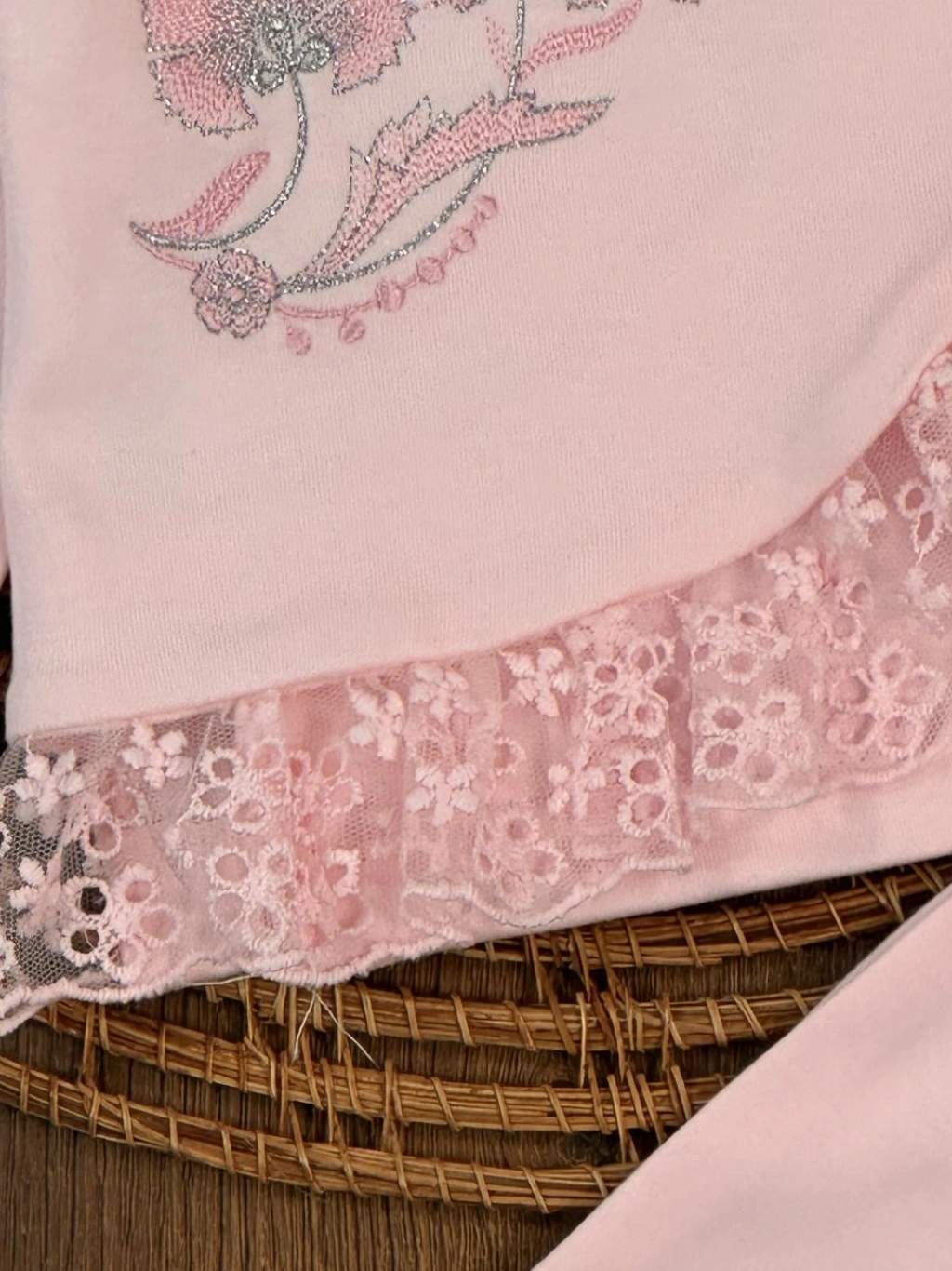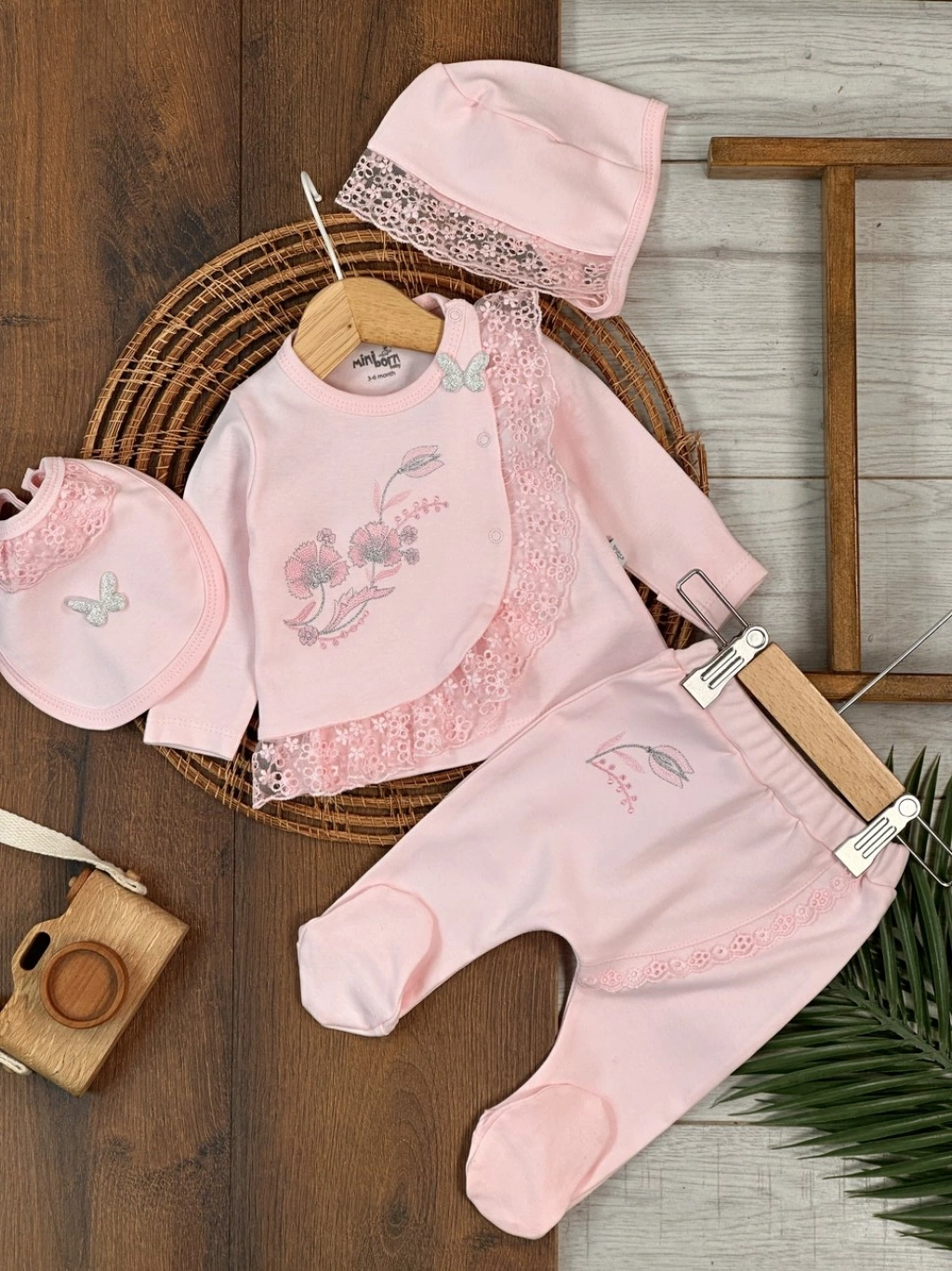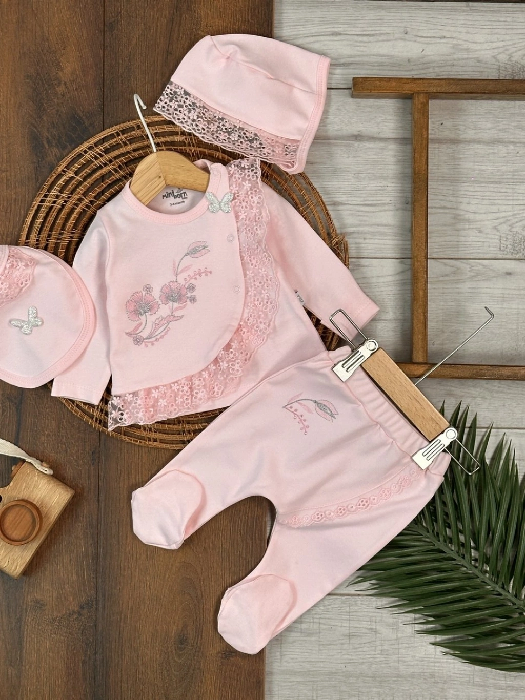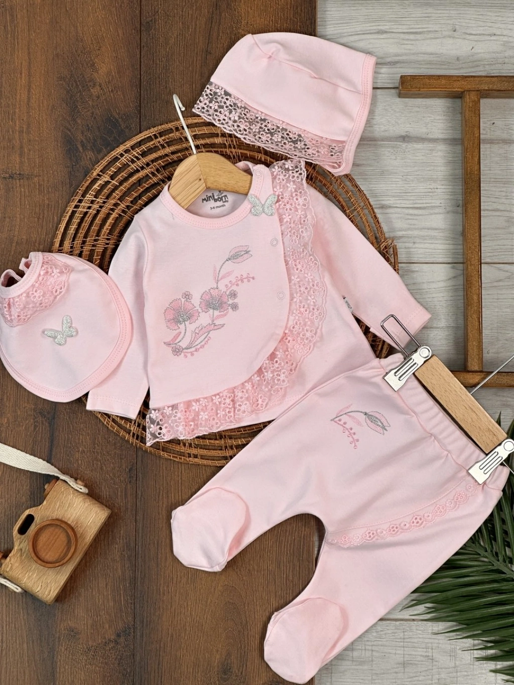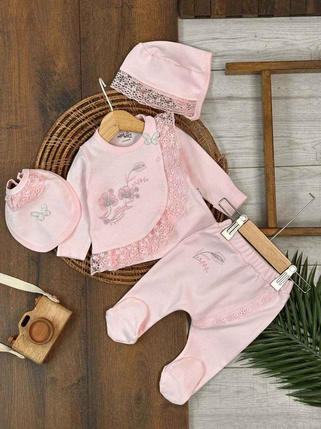 Pamuklu Çiçek Nakışlı Uzun Kollu Kız Bebek Hastane Çıkış Seti