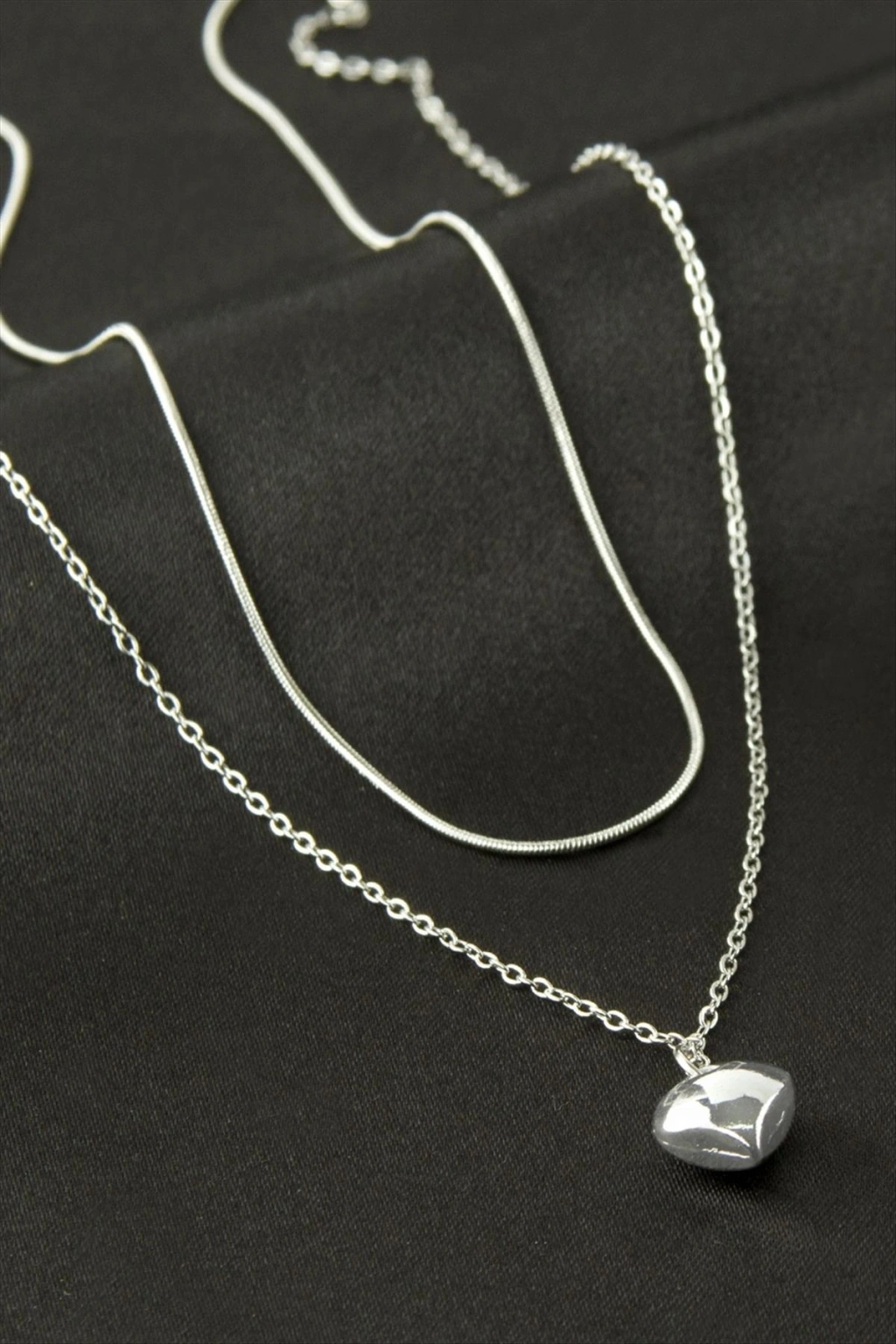 Kolye; Ürün zincir bölümü çeliktir. Zincir uzunluğu 50 cm ve ucundaki aparat boyu 1,5 cmdir. Kartlıdır. Çift zincirden üretilmiştir.