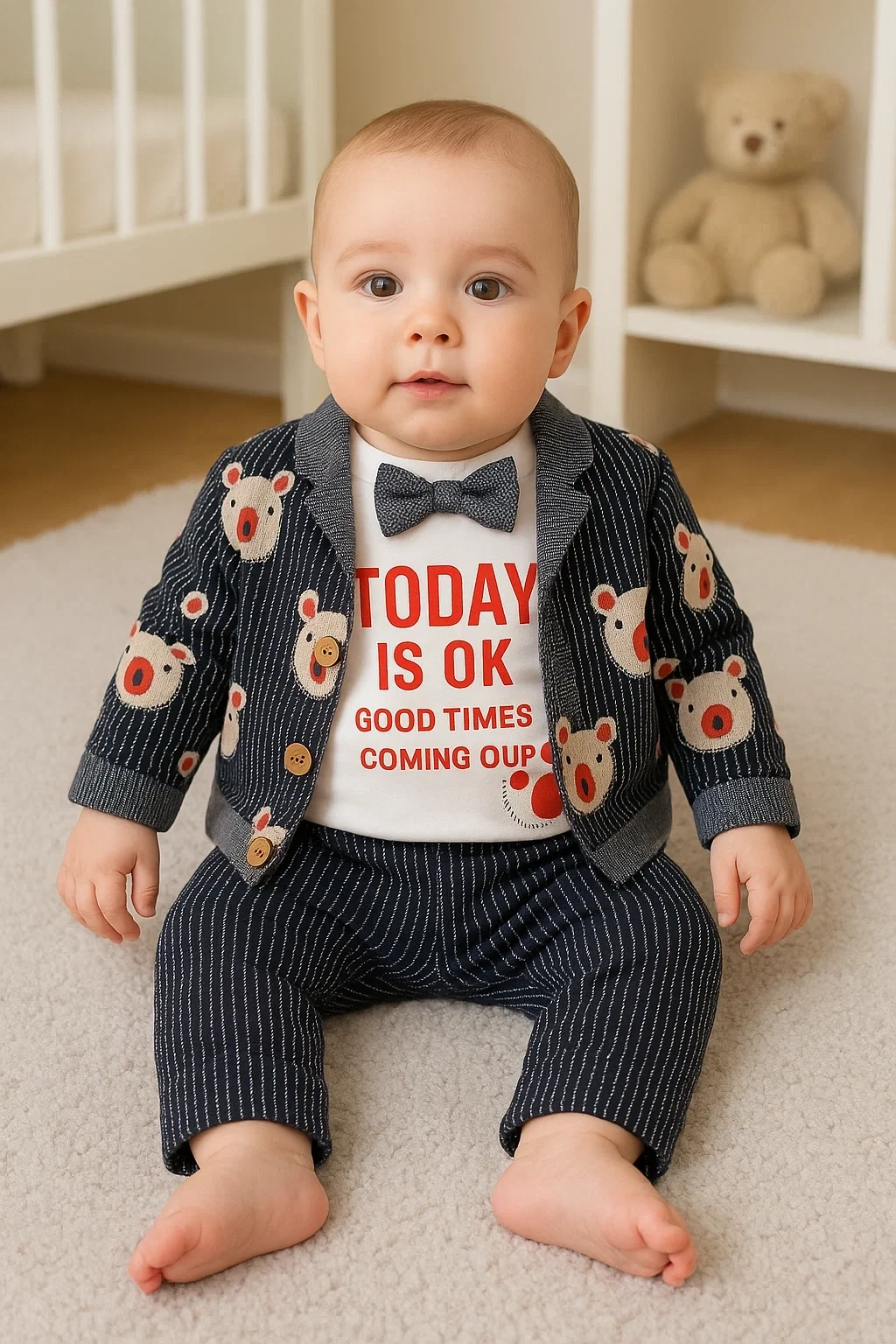 Papyonlu Bear Çizgili Model Ceketli 3'lü Erkek Bebek Takımı