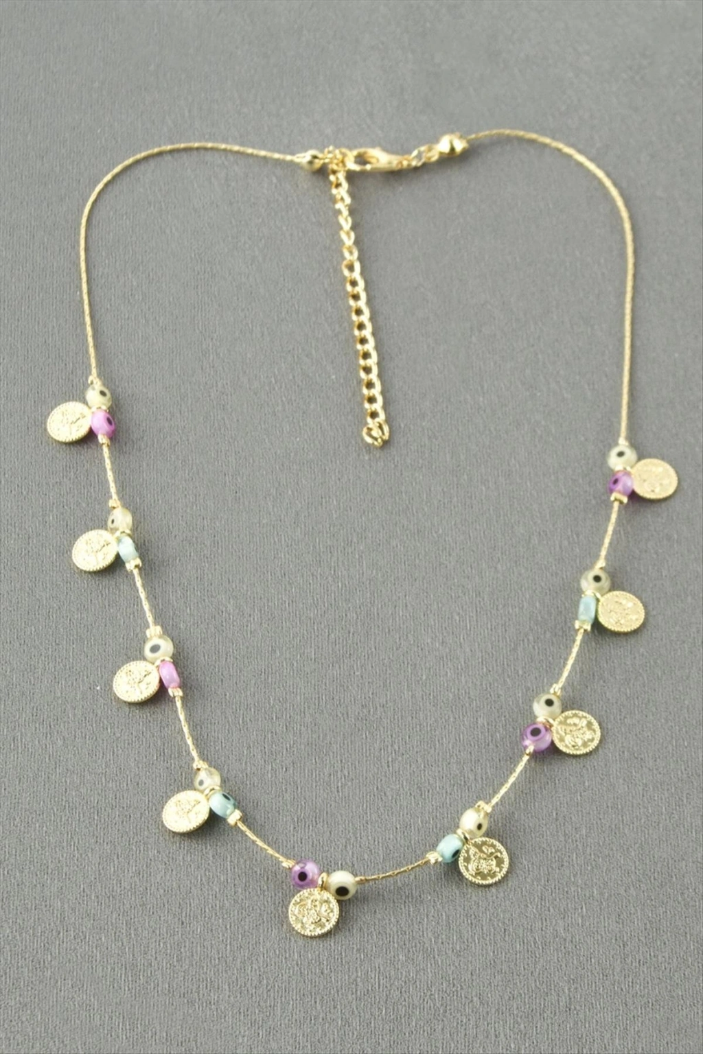 Kolye; Ürün malzemesi metal ve boncuktur. Ürün boyu 45 cmdir 1 sınıf kaliteli malzemeden üretilmiştir.