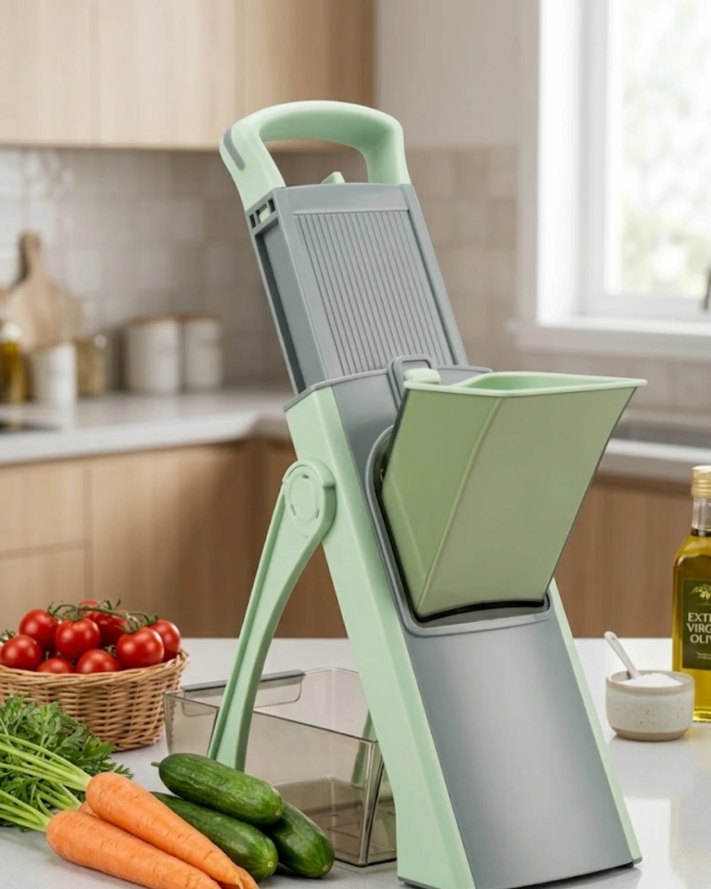 Dayanıklı çelik malzeme kullanımı sayesinde uzun ömürlü ve sağlam bir yapı sunan el rendesi, mutfakta güvenli ve pratik kullanım arayanlar için ideal bir çözümdür. Yüksek kaliteli paslanmaz çelikten üretilmiş olan doğrama bıçakları, sebze ve meyveleri rahatlıkla dilimlemenize ve doğramanıza olanak tanır. Keskin bıçak yapısı sayesinde minimum eforla maksimum verim elde edilir.Üst kısmında yer alan özel at, sadece birkaç hamleyle malzemelerinizi istediğiniz kalınlıkta doğramanızı sağlar. Bu sistem, hem hız kazandırır hem de mutfakta geçirilen zamanı önemli ölçüde azaltır. Eşsiz tasarımı sayesinde elleriniz bıçaklara yaklaşmaz ve bu da ürünü günlük kullanım için son derece güvenli hale getirir.Kompakt ve katlanabilir yapısı, kullanım sonrası kolay saklama imkânı sunar. Dolap içinde veya çekmecede minimum yer kaplar. Ürünle birlikte gelen temizlik fırçası, bıçaklar arasında biriken gıda artıklarının kolayca temizlenmesini sağlar. Ayrıca entegre yiyecek toplama haznesi, doğrama sırasında tezgâhın temiz kalmasına yardımcı olur.Kolay temizlenebilir yüzeyi ve şık, modern tasarımı ile mutfak dekorasyonuna es bir dokunuş katar. Hem fonksiyonel hem de görsel olarak beklentileri karşılayan bu el rendesi, mutfağın vazgeçilmez yardımcılarından biri olmaya adaydır.