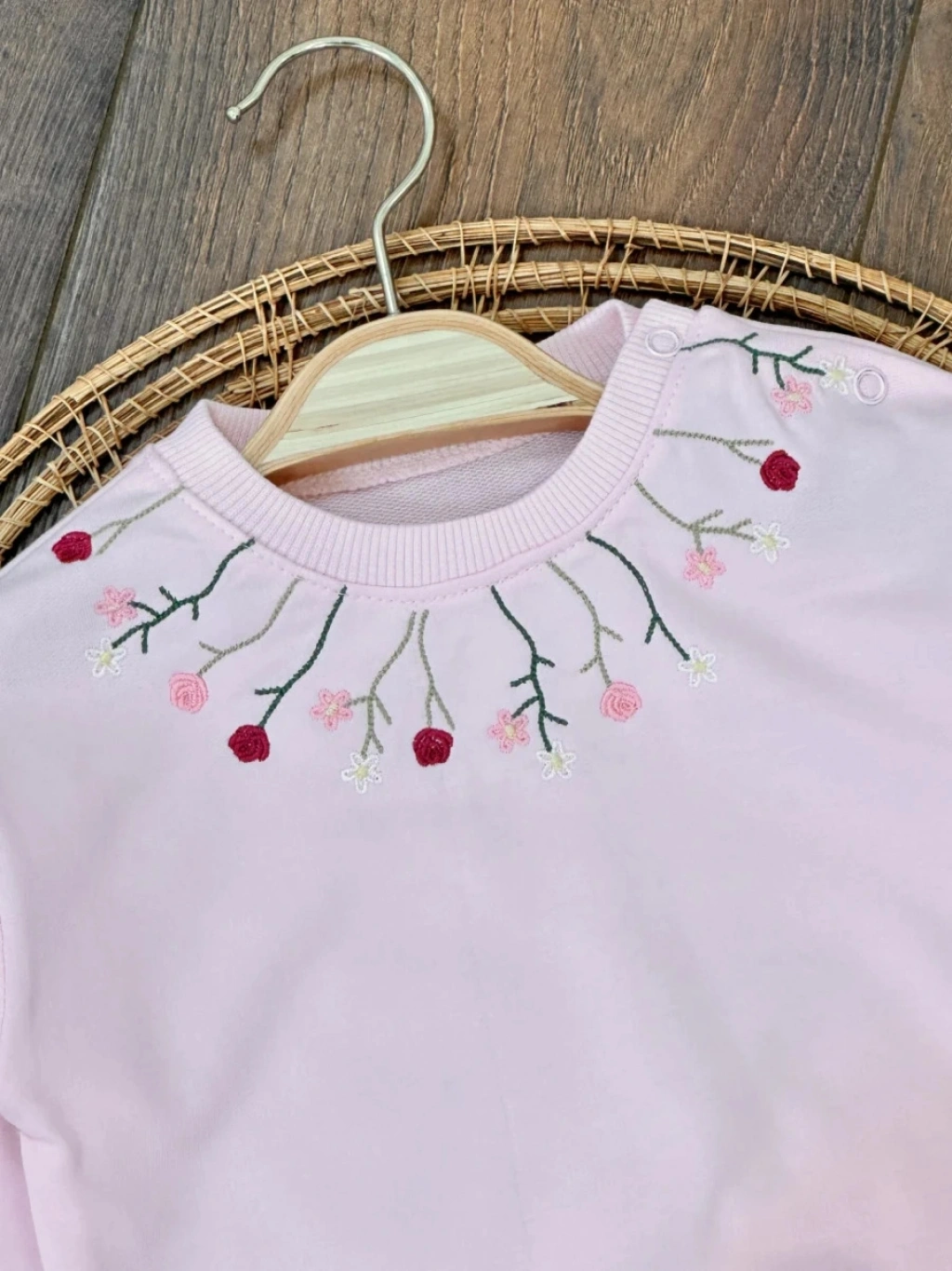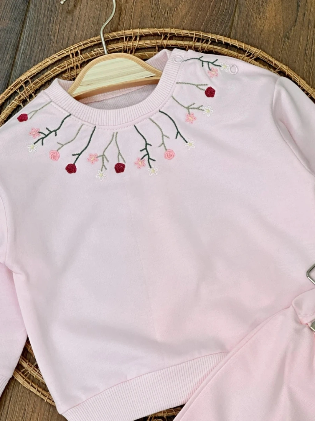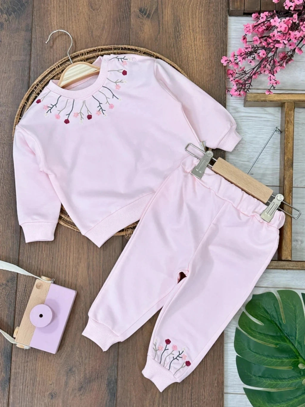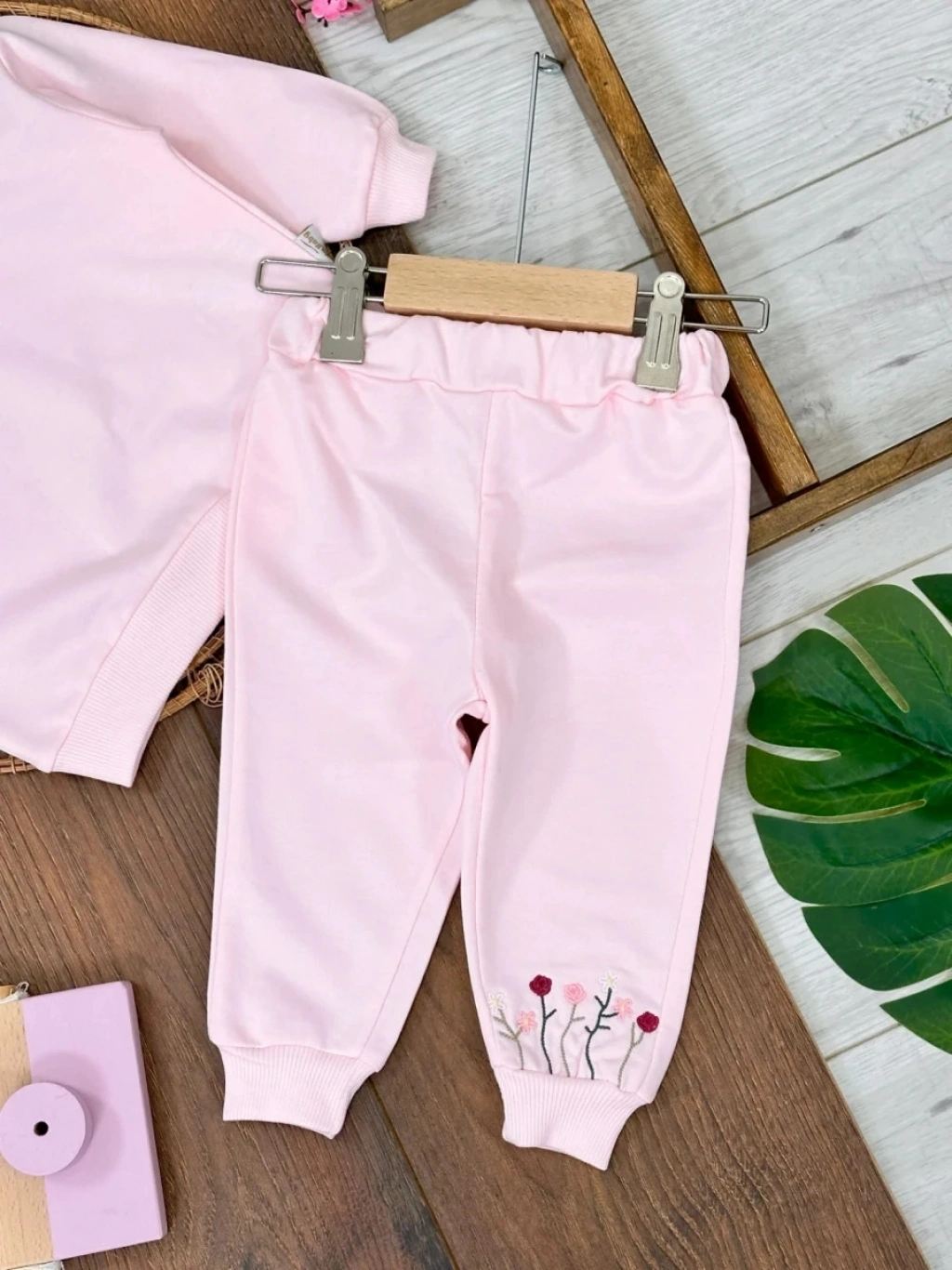 Pembe Kız Bebek Pamuklu Nakışlı Çiçek İşlemeli Lastikli Paça 2 İplik Takım