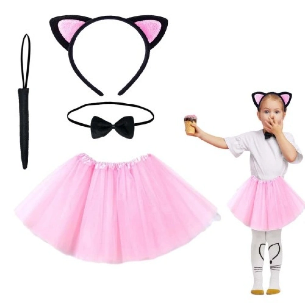 Pembe Renk Etekli Kedi Kostüm Seti (Tütü, Taç, Papyon, Kuyruk)
