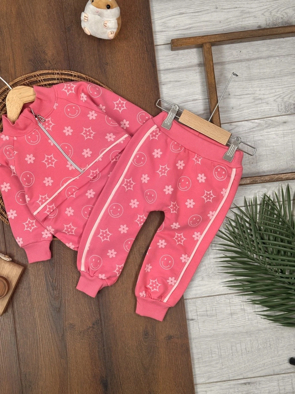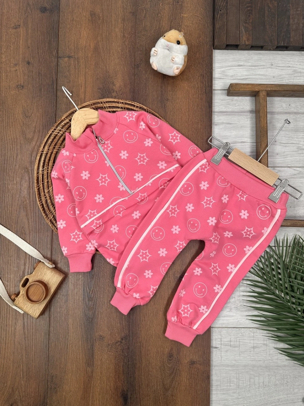 PEMBE BİSİKLET YAKA UZUN KOLLU LASTİKLİ BEL PAÇA ŞAPKALI KIZ ÇOCUK & BEBEK ALT ÜST TAKIM