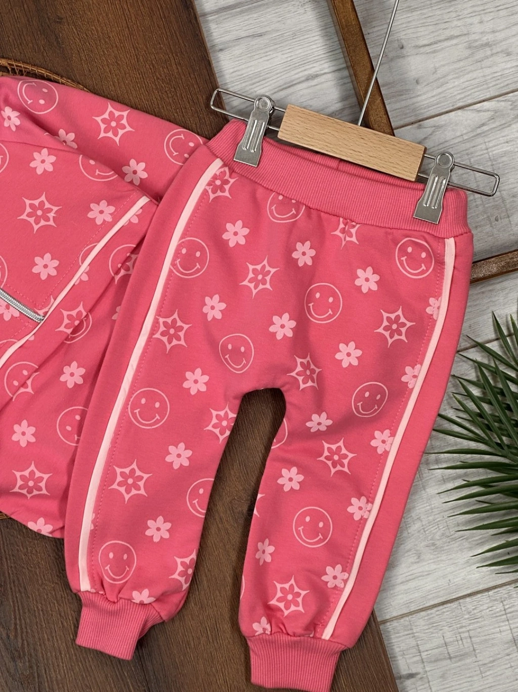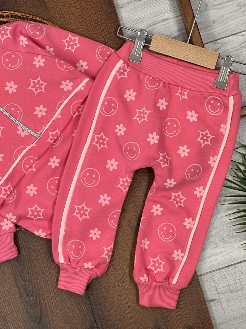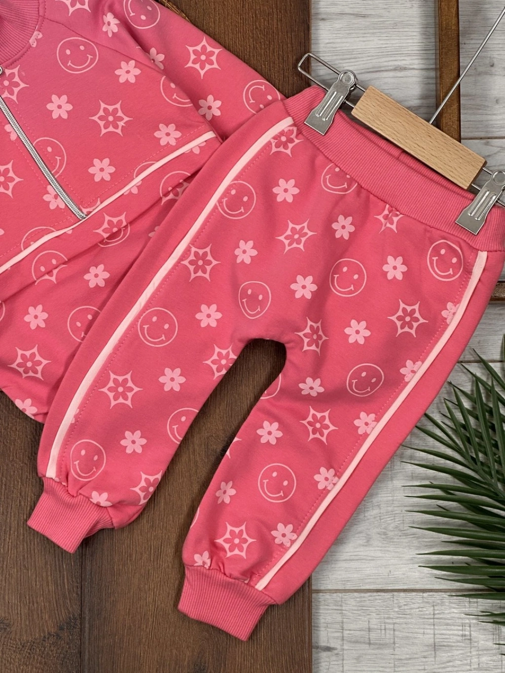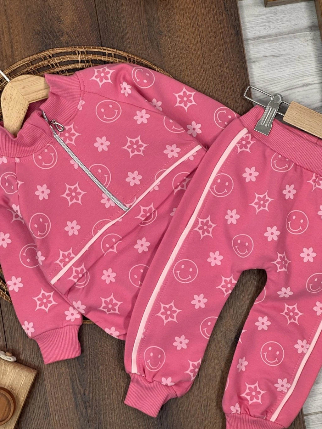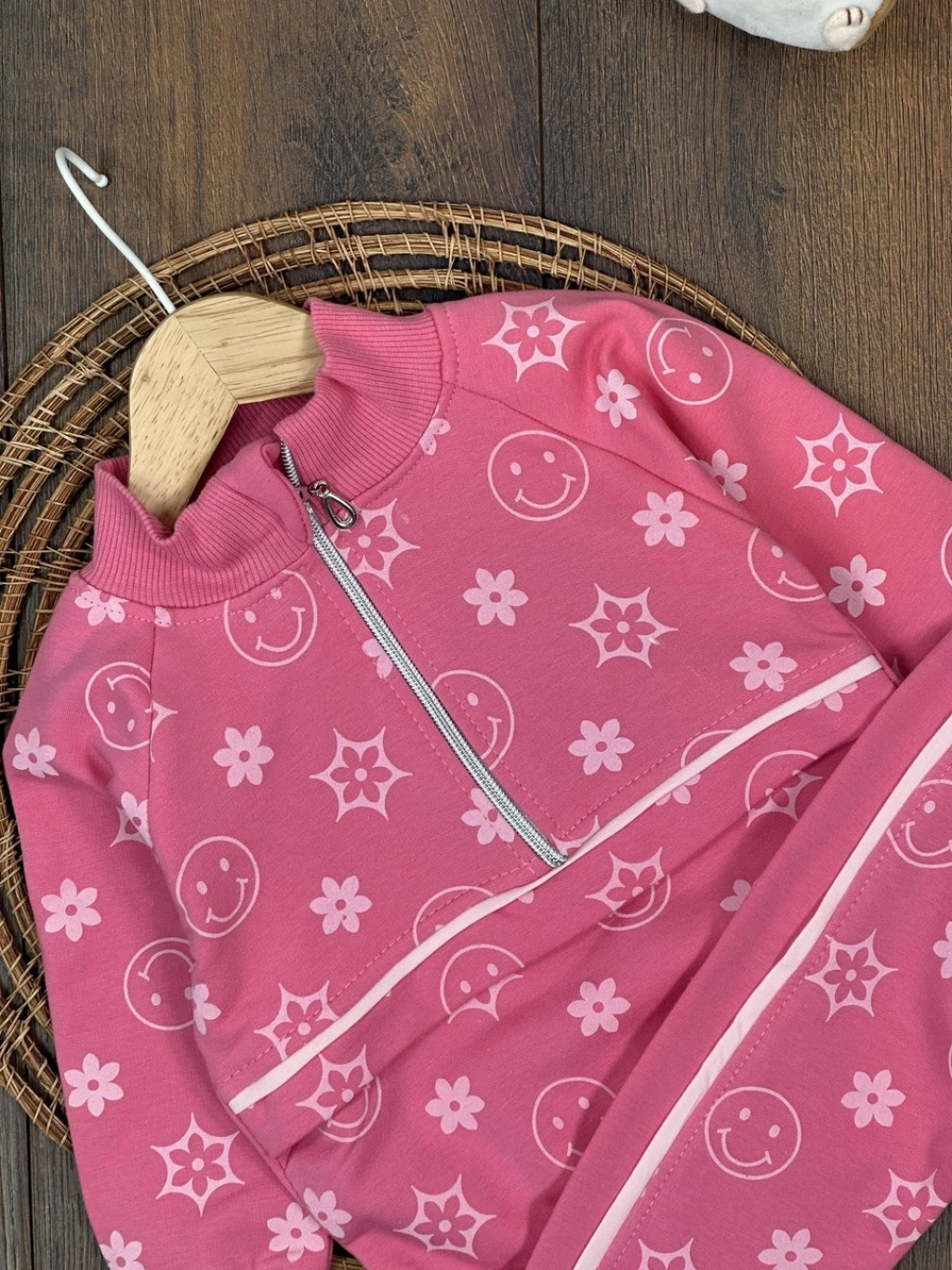 PEMBE RENK FERMUARLI DİK YAKA ÇİZGİLİ ÇİZGİLİ PAÇALARI LASTİKLİ KIZ ÇOCUK & BEBEK TAKIM